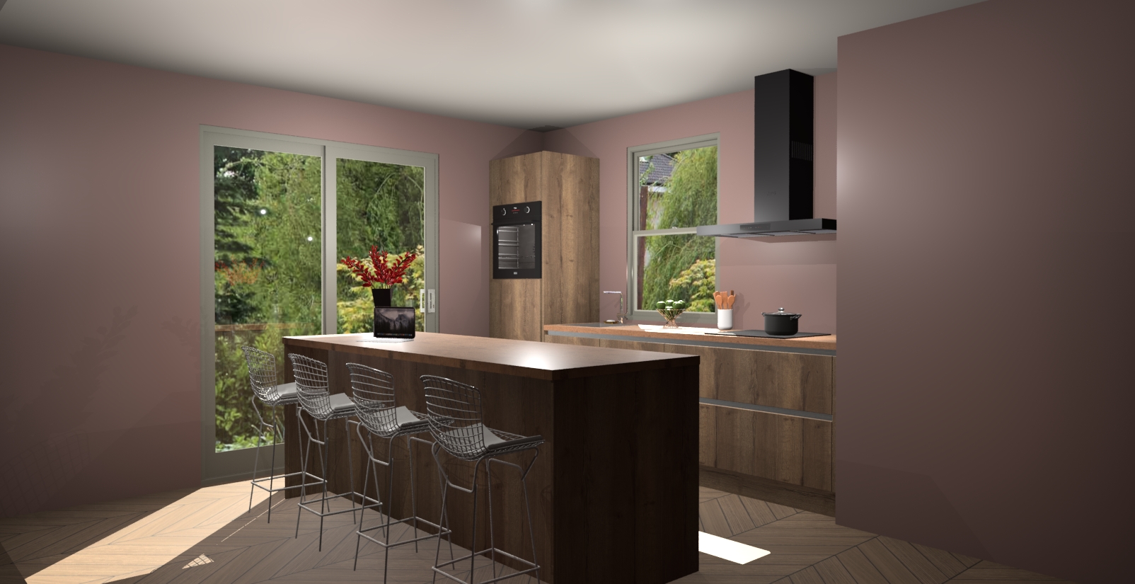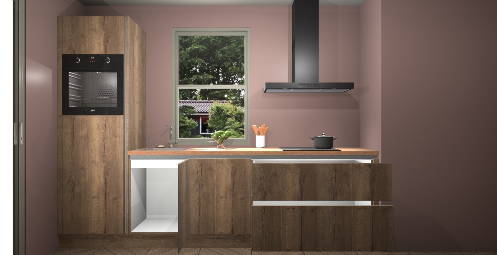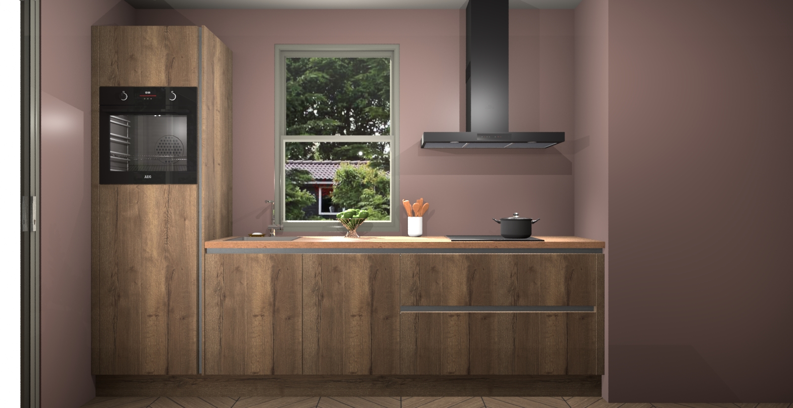 Een stijlvolle en praktische keuken als deze mag gezien worden. Dankzij de prachtige Chocolade Eiken afwerking wordt de keuken gemakkelijk het middelpunt van uw huis - hij ziet er geweldig uit onder allerlei lichtomstandigheden, van dag tot nacht!