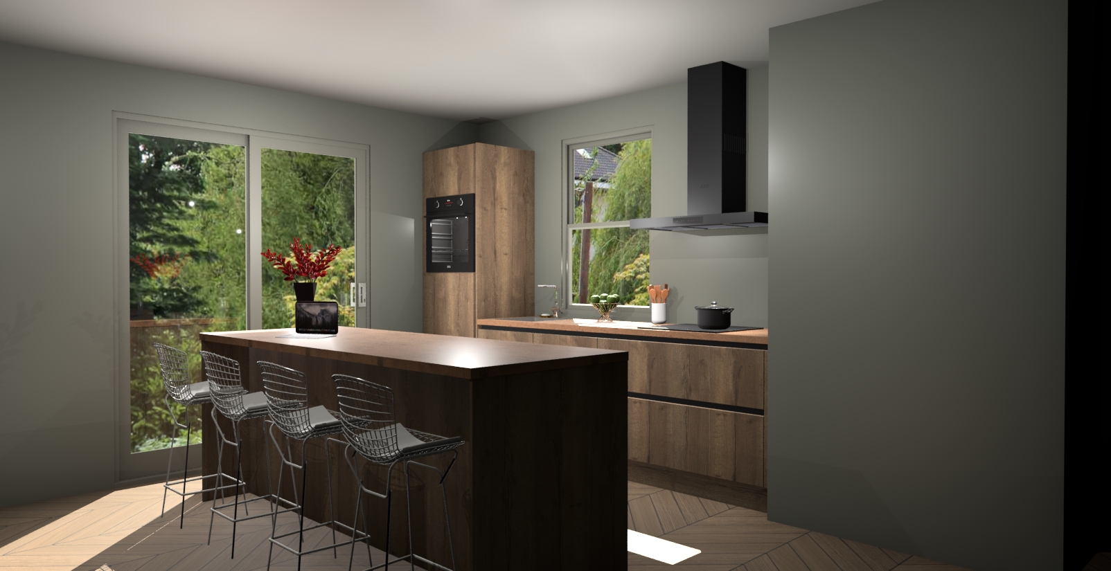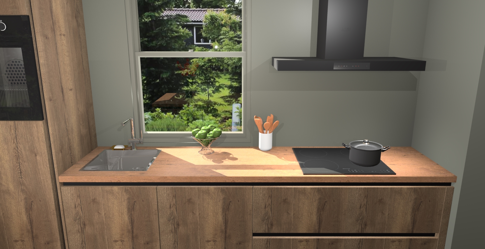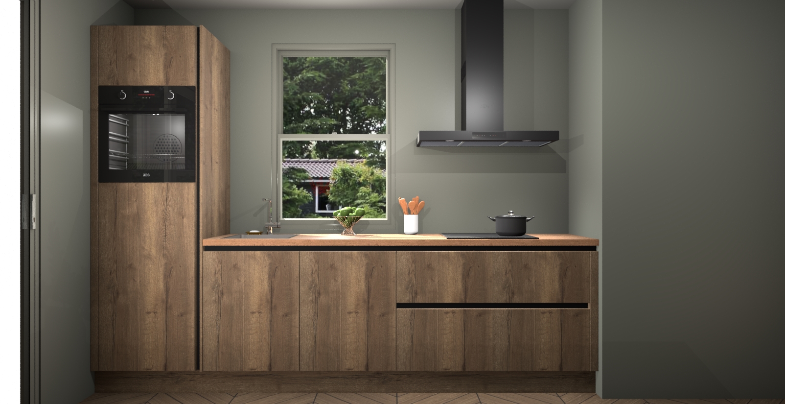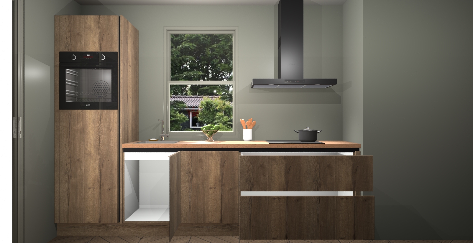 Een stijlvolle en praktische keuken als deze mag gezien worden. Dankzij de prachtige Chocolade Eiken afwerking wordt de keuken gemakkelijk het middelpunt van uw huis - hij ziet er geweldig uit onder allerlei lichtomstandigheden, van dag tot nacht!