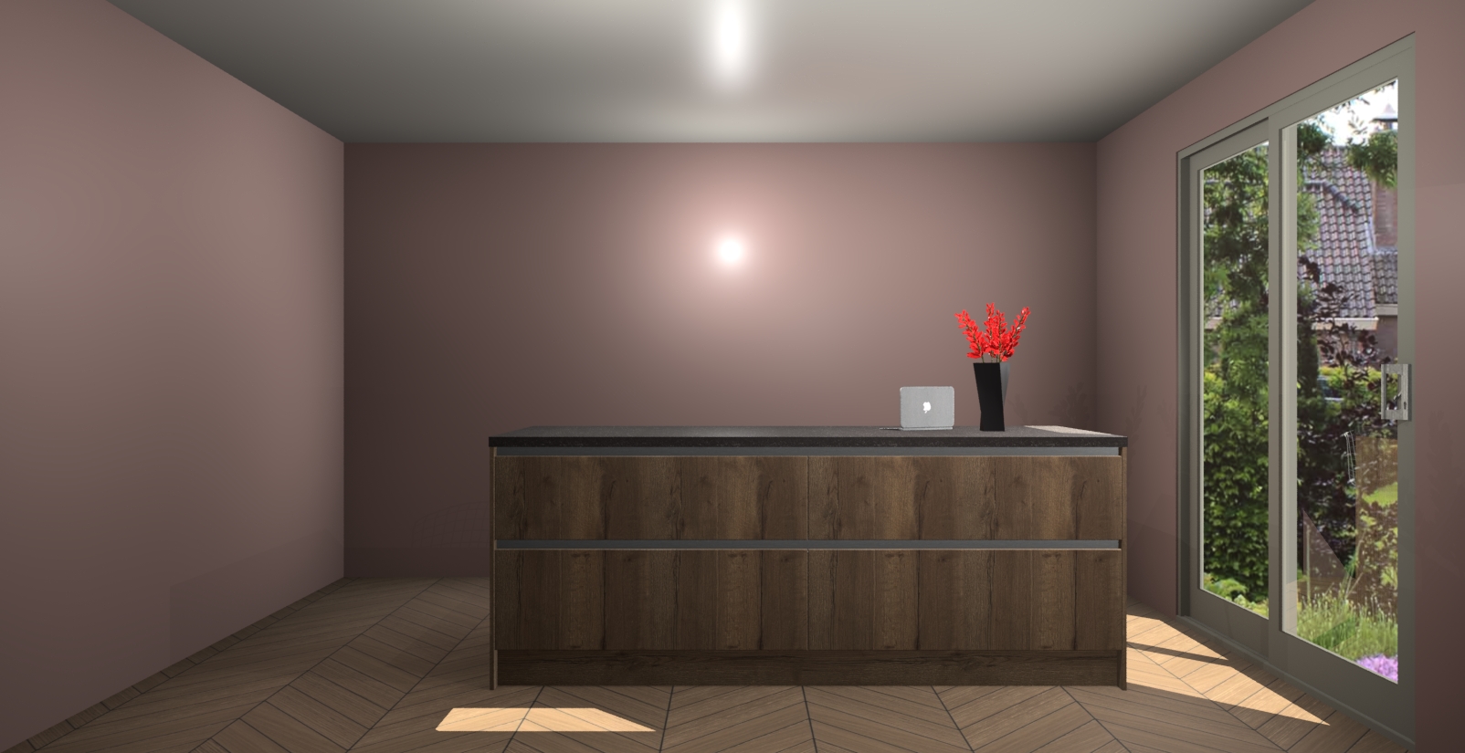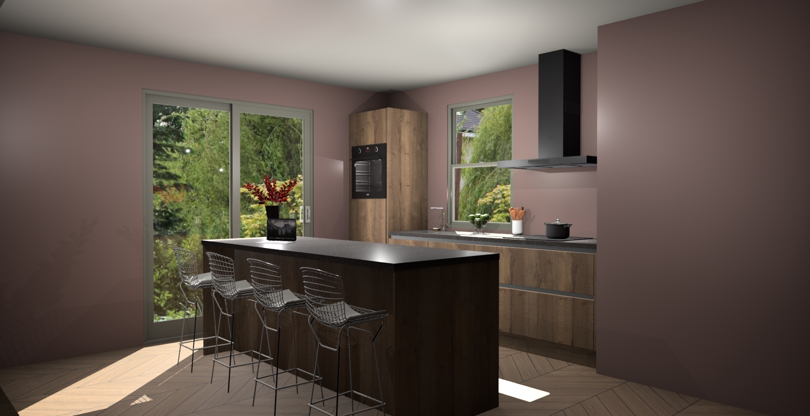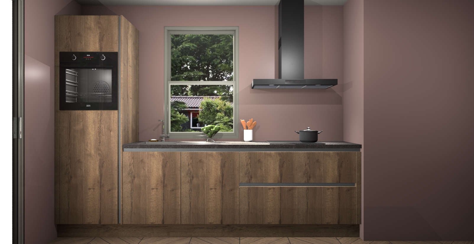 Een stijlvolle en praktische keuken als deze mag gezien worden. Dankzij de prachtige Chocolade Eiken afwerking wordt de keuken gemakkelijk het middelpunt van uw huis - hij ziet er geweldig uit onder allerlei lichtomstandigheden, van dag tot nacht!