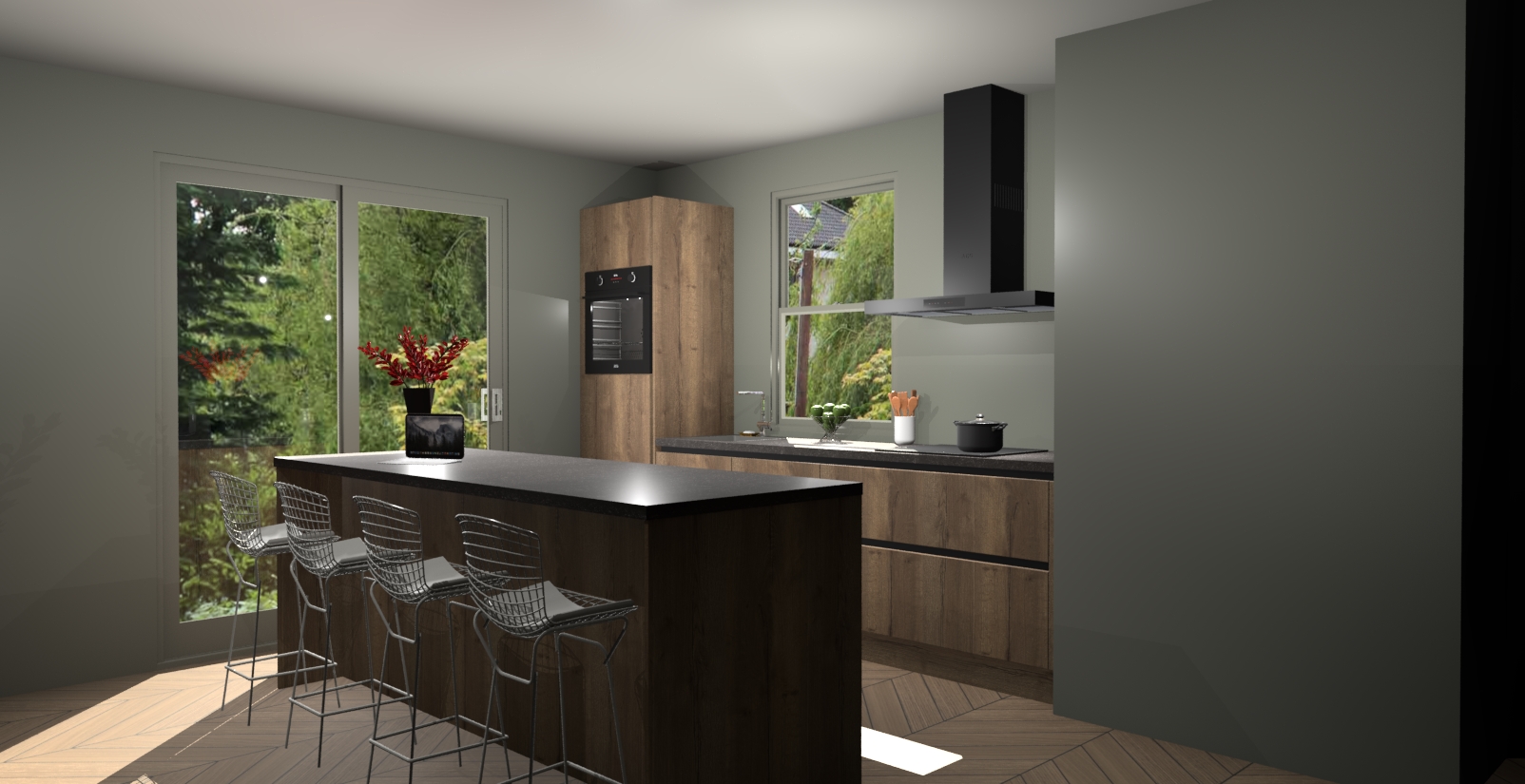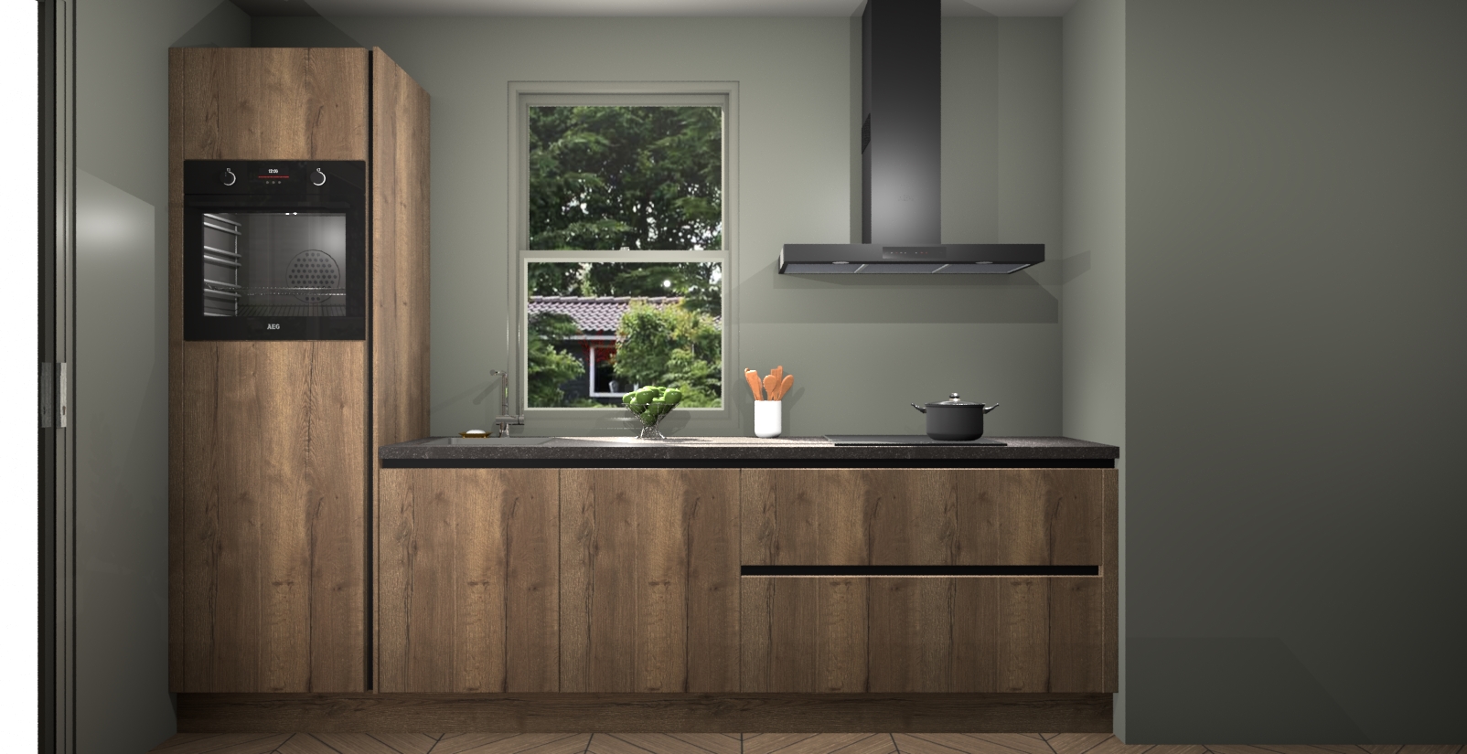 Een stijlvolle en praktische keuken als deze mag gezien worden. Dankzij de prachtige Chocolade Eiken afwerking wordt de keuken gemakkelijk het middelpunt van uw huis - hij ziet er geweldig uit onder allerlei lichtomstandigheden, van dag tot nacht!