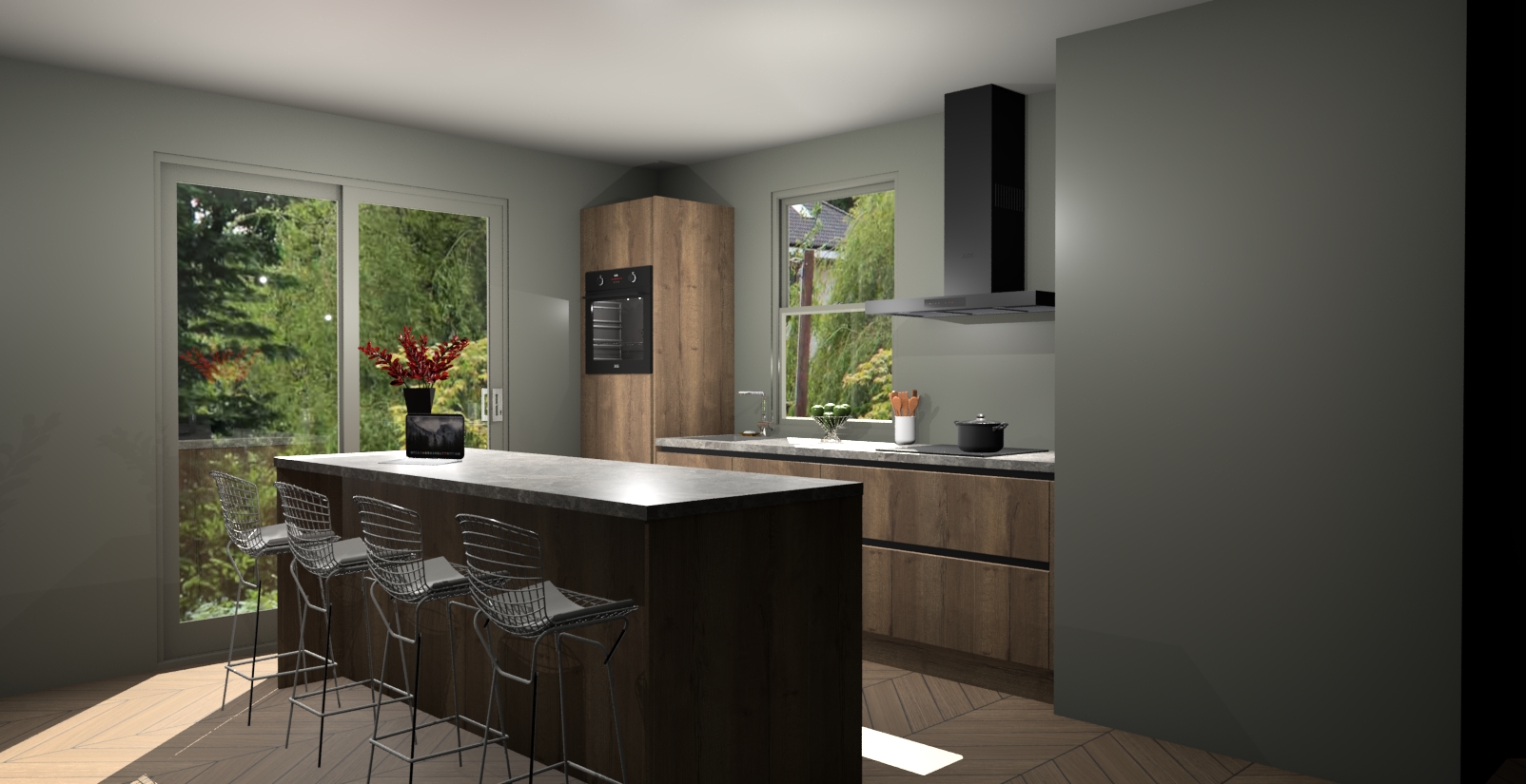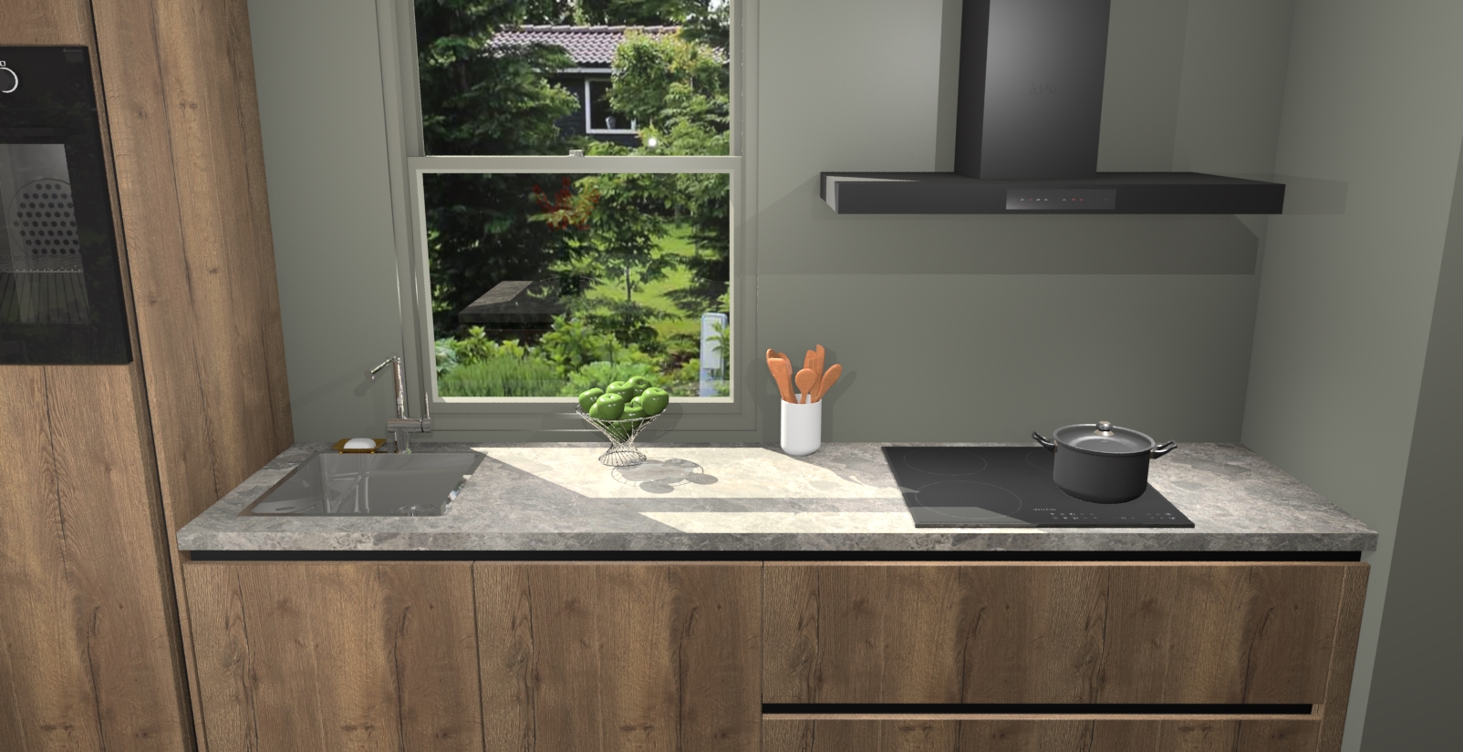 Een stijlvolle en praktische keuken als deze mag gezien worden. Dankzij de prachtige Chocolade Eiken afwerking wordt de keuken gemakkelijk het middelpunt van uw huis - hij ziet er geweldig uit onder allerlei lichtomstandigheden, van dag tot nacht!
