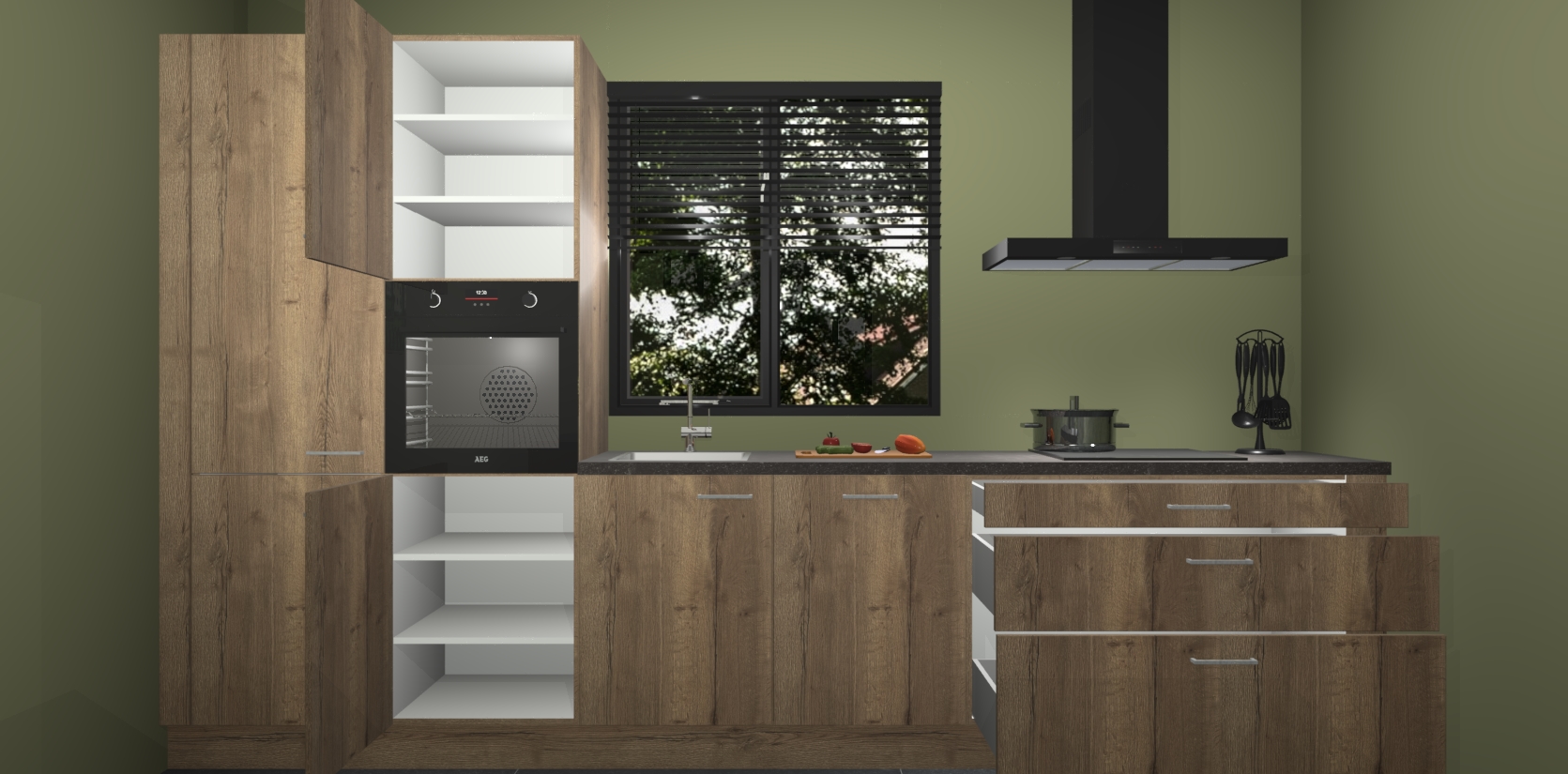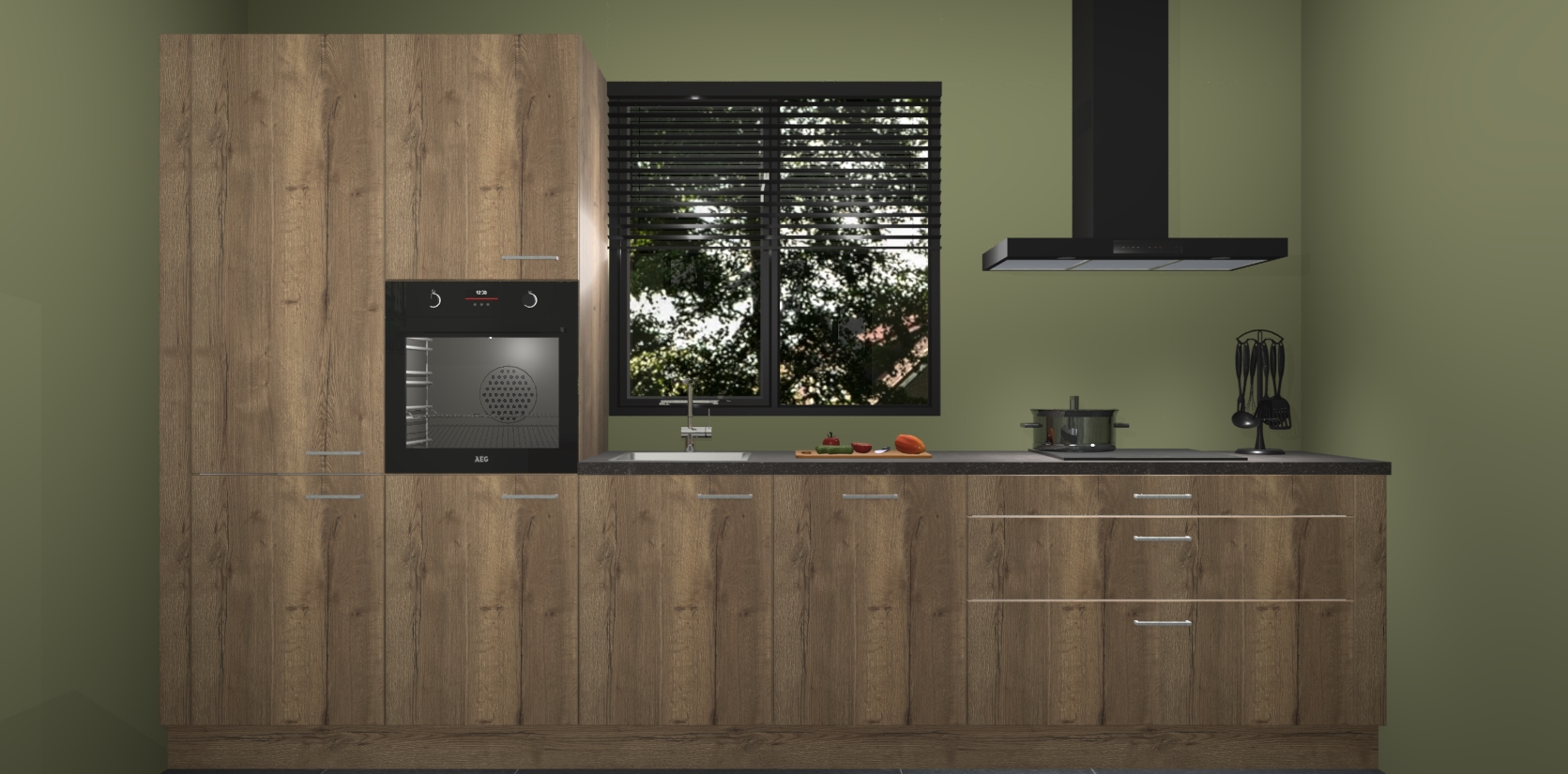 Maak kennis met de chocolade eiken keuken Bonaire: de perfecte balans tussen tijdloos en modern. Met voldoende opbergruimte zal deze keuken de afgunst van uw vrienden en familie zijn, terwijl uw leven moeiteloos georganiseerd en rommelvrij blijft.