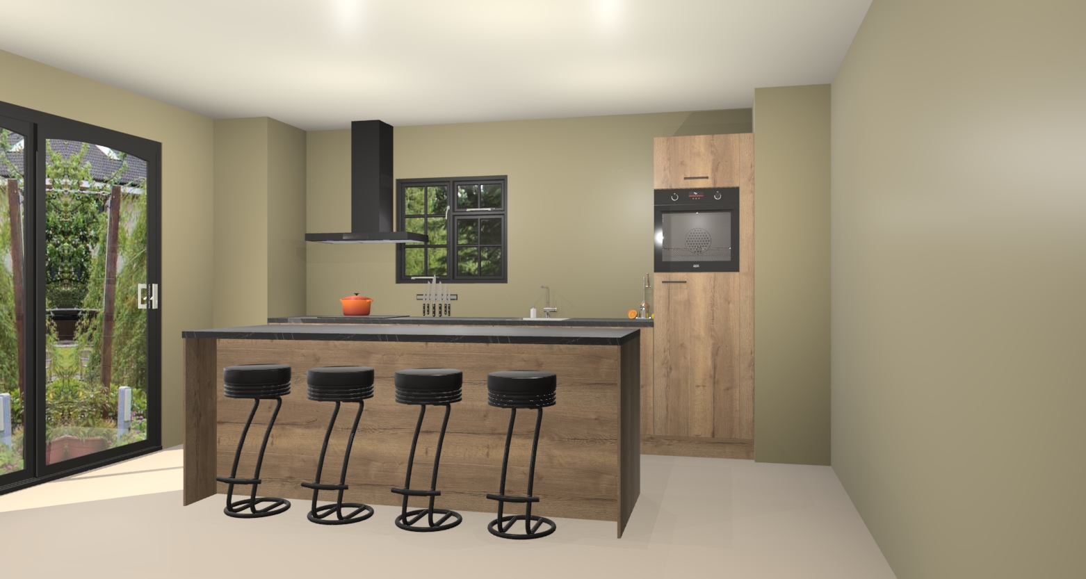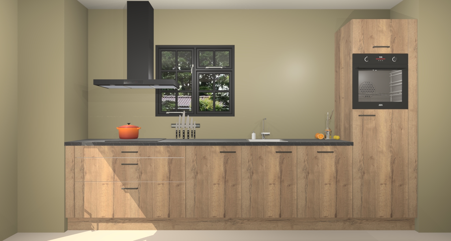Maak kennis met de chocolade eiken keuken Palau: de perfecte mix van stijl en gemak. De keuken heeft vijf inbouw apparaten, plus een werkblad in houtlook dat meteen warmte en verfijning toevoegt.
