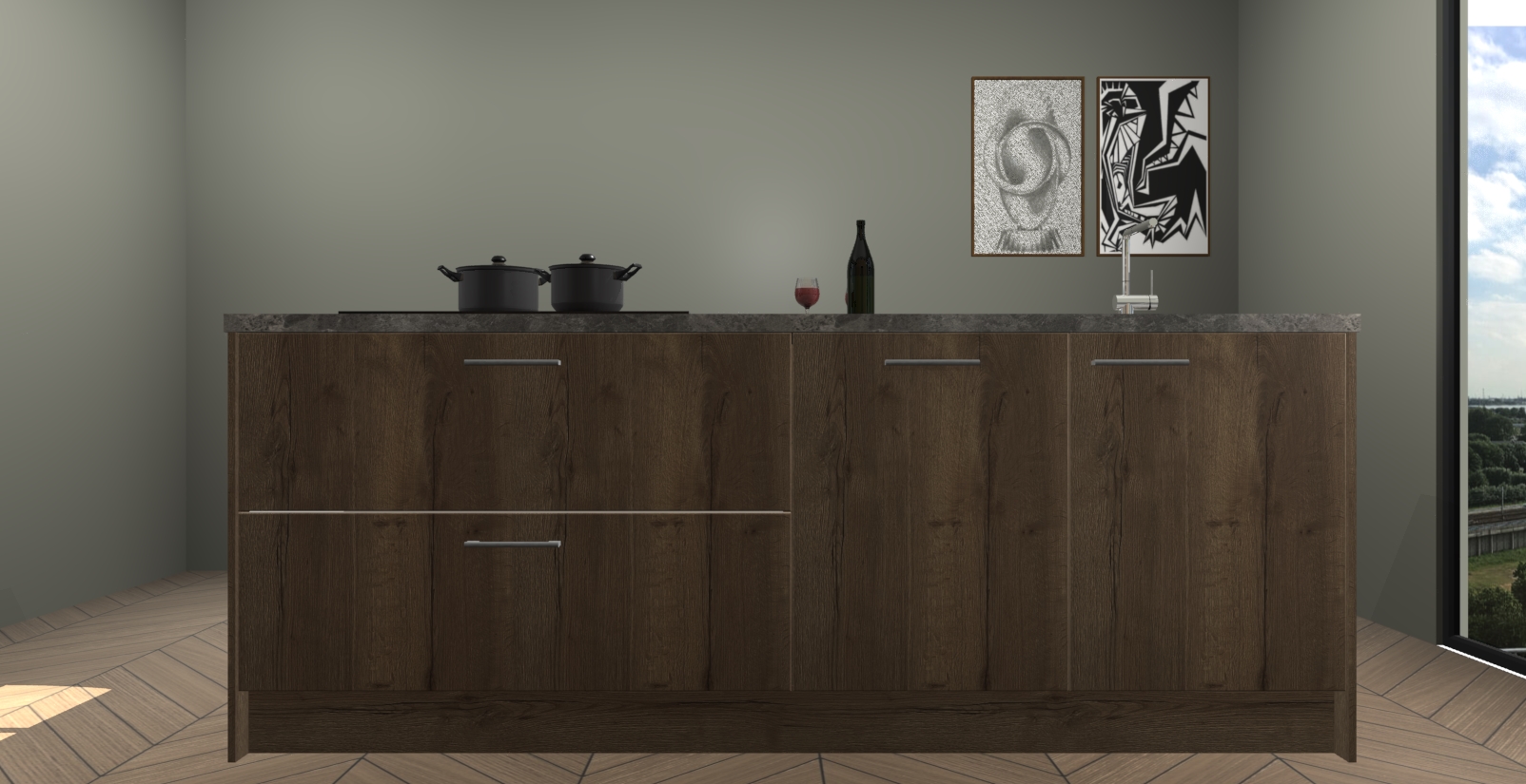 Breng luxe in uw keuken met de Chocolade Eiken Rusiec  Keuken! Dit prachtige kookeiland straalt elegantie uit en laat elke ruimte er modern en verfijnd uitzien. De strakke Chocolade Eiken kleur geeft uw keuken een gevoel van sfeer en verfijning dat u bij andere stijlen niet krijgt.