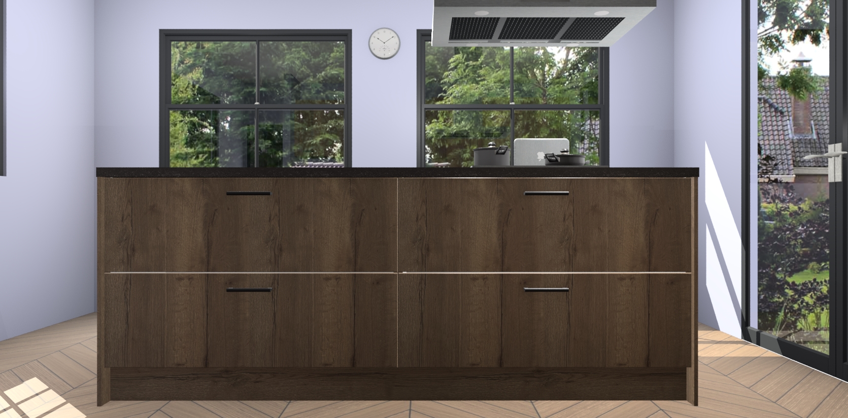 Maak kennis met de nieuwe Chocolade Eiken keuken Straatsburg, dat gemaakt is voor de moderne huiseigenaar. Deze chique en eigentijdse keuken geeft uw huis een instant upgrade. Het Chocolade Eiken ontwerp creëert de perfecte balans tussen elegantie en functionaliteit en geeft uw ruimte een strakke, uitnodigende sfeer. Het spoeleiland geeft ruime opbergruimte en met de soft-close deuren is deze keuken perfect voor elk huis.