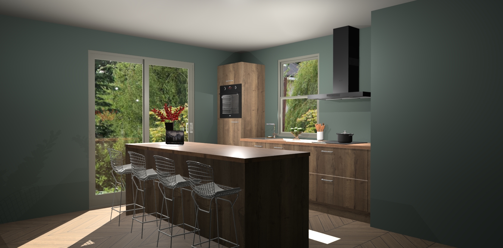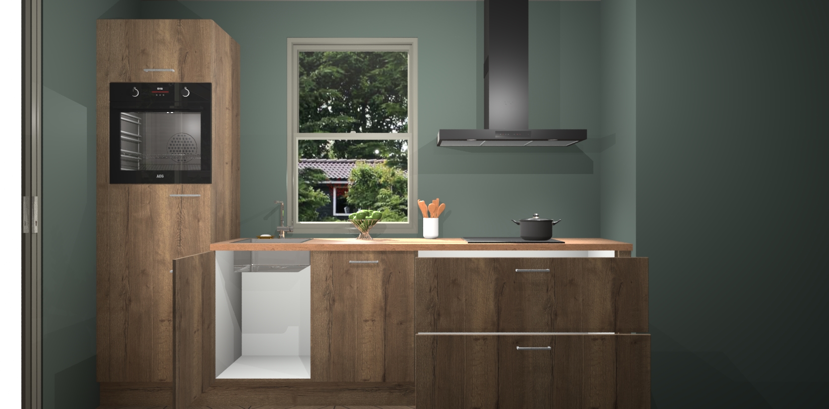 Een stijlvolle en praktische keuken als deze mag gezien worden. Dankzij de prachtige Chocolade Eiken afwerking wordt de keuken gemakkelijk het middelpunt van uw huis - hij ziet er geweldig uit onder allerlei lichtomstandigheden, van dag tot nacht!