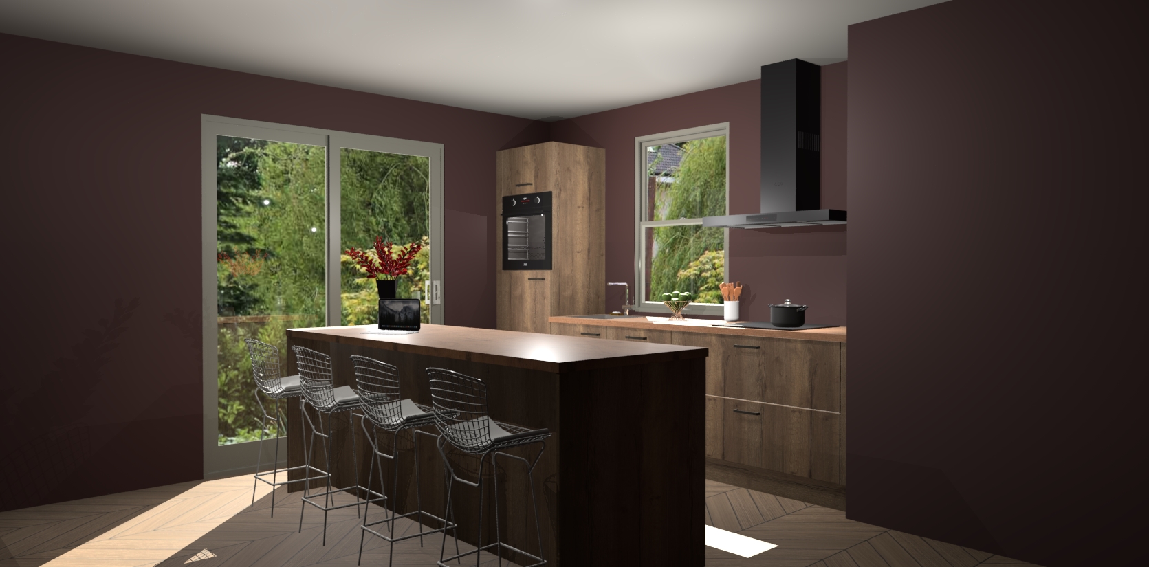 Een stijlvolle en praktische keuken als deze mag gezien worden. Dankzij de prachtige Chocolade Eiken afwerking wordt de keuken gemakkelijk het middelpunt van uw huis - hij ziet er geweldig uit onder allerlei lichtomstandigheden, van dag tot nacht!