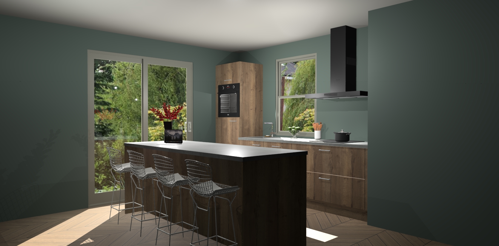 Een stijlvolle en praktische keuken als deze mag gezien worden. Dankzij de prachtige Chocolade Eiken afwerking wordt de keuken gemakkelijk het middelpunt van uw huis - hij ziet er geweldig uit onder allerlei lichtomstandigheden, van dag tot nacht!
