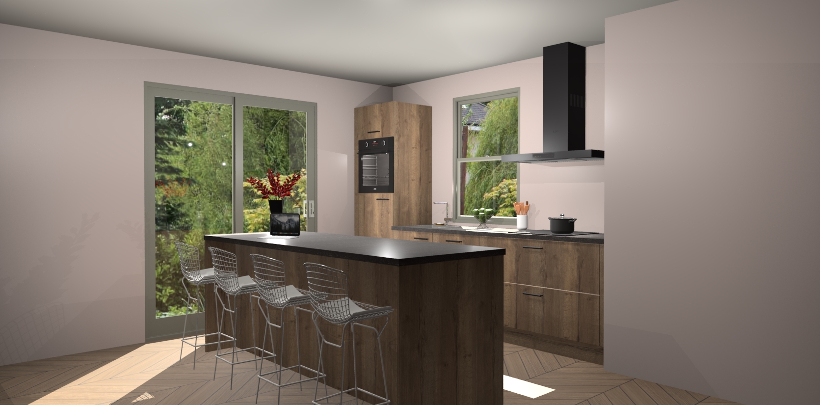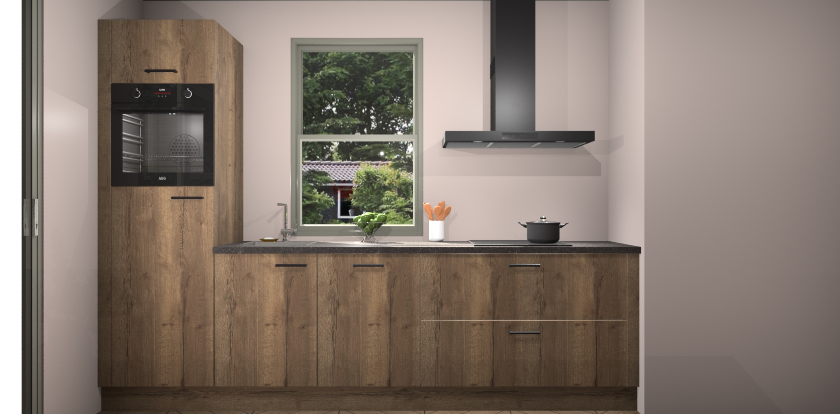 Een stijlvolle en praktische keuken als deze mag gezien worden. Dankzij de prachtige Chocolade Eiken afwerking wordt de keuken gemakkelijk het middelpunt van uw huis - hij ziet er geweldig uit onder allerlei lichtomstandigheden, van dag tot nacht!