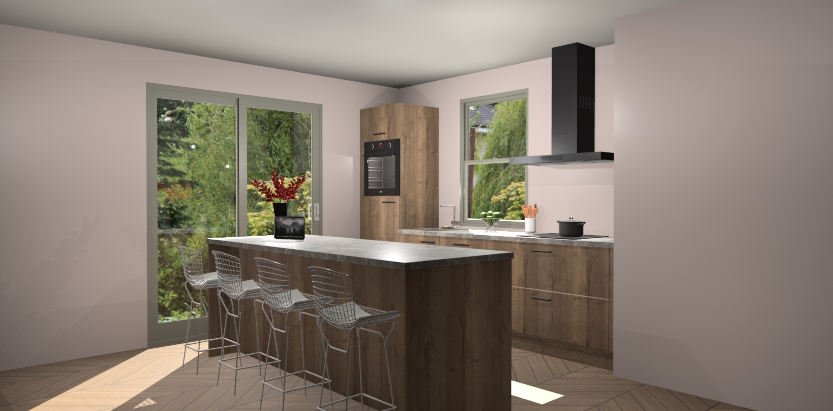 Een stijlvolle en praktische keuken als deze mag gezien worden. Dankzij de prachtige Chocolade Eiken afwerking wordt de keuken gemakkelijk het middelpunt van uw huis - hij ziet er geweldig uit onder allerlei lichtomstandigheden, van dag tot nacht!