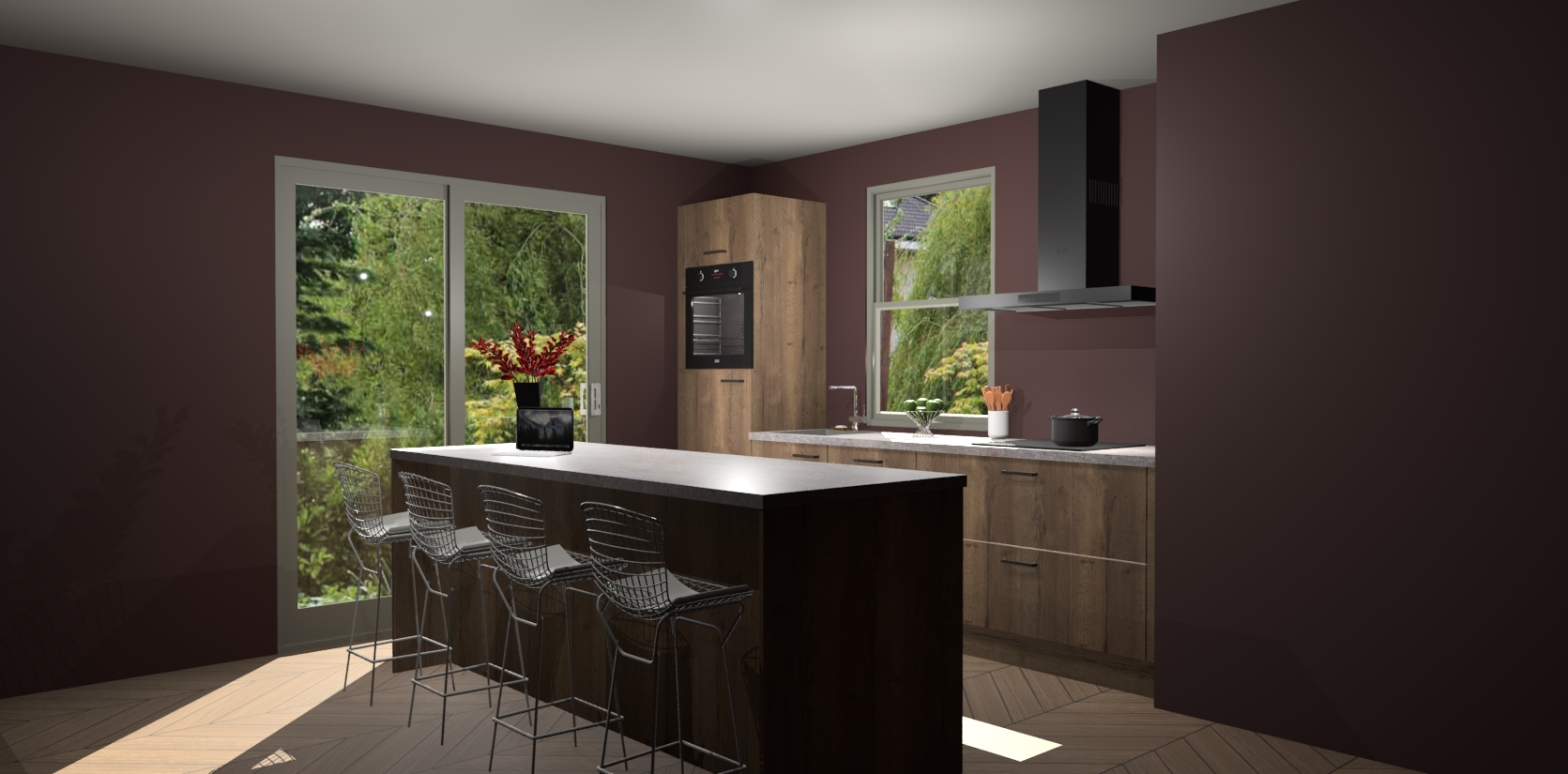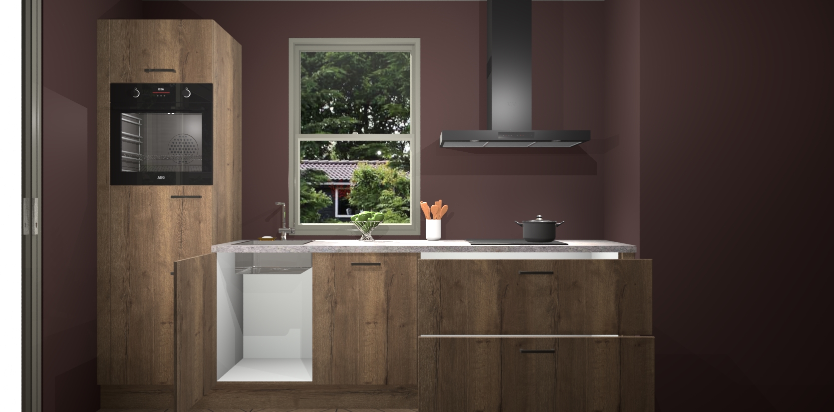 Een stijlvolle en praktische keuken als deze mag gezien worden. Dankzij de prachtige Chocolade Eiken afwerking wordt de keuken gemakkelijk het middelpunt van uw huis - hij ziet er geweldig uit onder allerlei lichtomstandigheden, van dag tot nacht!