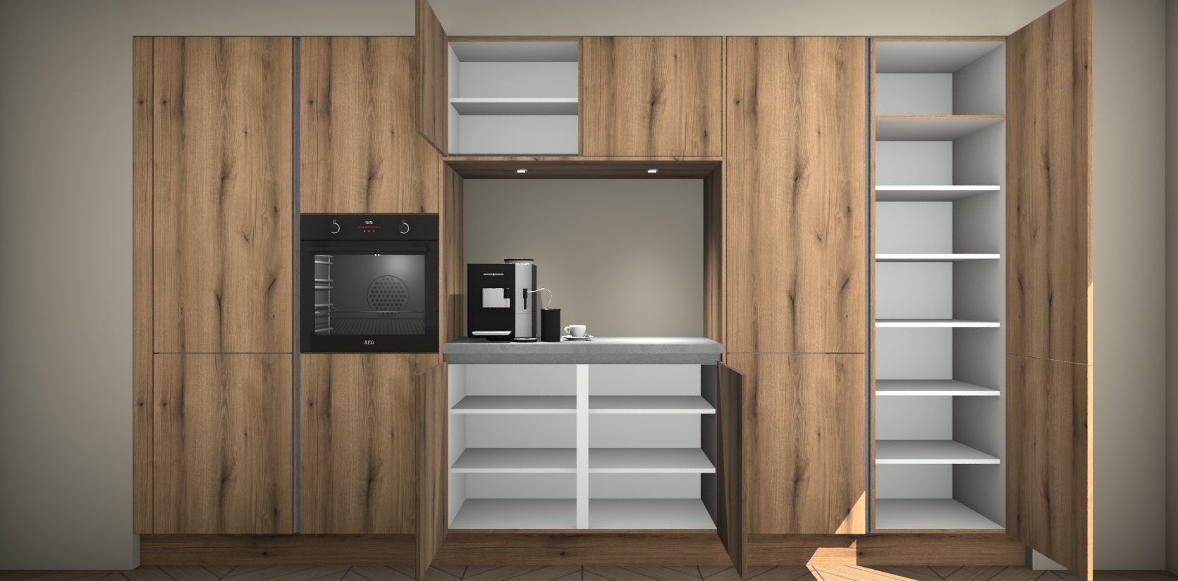 De Goud Eiken greeploze keuken Lodz wordt geleverd met een set van 5 ingebouwde apparaten: Een oven, inductiekookplaat, afzuigkap, vaatwasser en koelkast. Deze kunnen gemakkelijk worden opgewaardeerd naar AEG. Met de gegarandeerde lage prijs en de snelle levering van 7 weken kan u er op rekenen dat de Goud Eiken greeploze keuken Lodz zo snel mogelijk uw huis bereikt!
