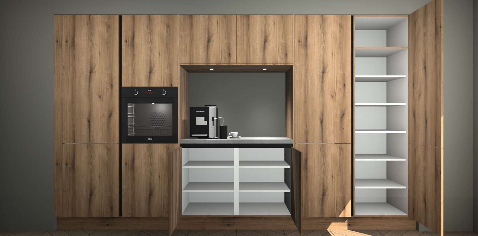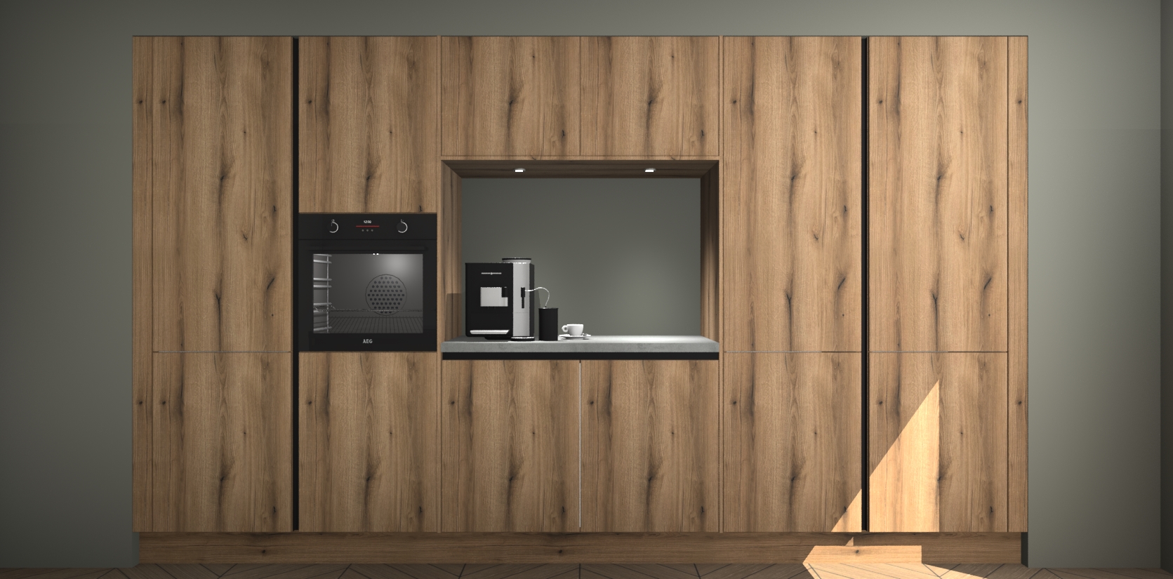 De Goud Eiken greeploze keuken Lodz wordt geleverd met een set van 5 ingebouwde apparaten: Een oven, inductiekookplaat, afzuigkap, vaatwasser en koelkast. Deze kunnen gemakkelijk worden opgewaardeerd naar AEG. Met de gegarandeerde lage prijs en de snelle levering van 7 weken kan u er op rekenen dat de Goud Eiken greeploze keuken Lodz zo snel mogelijk uw huis bereikt!