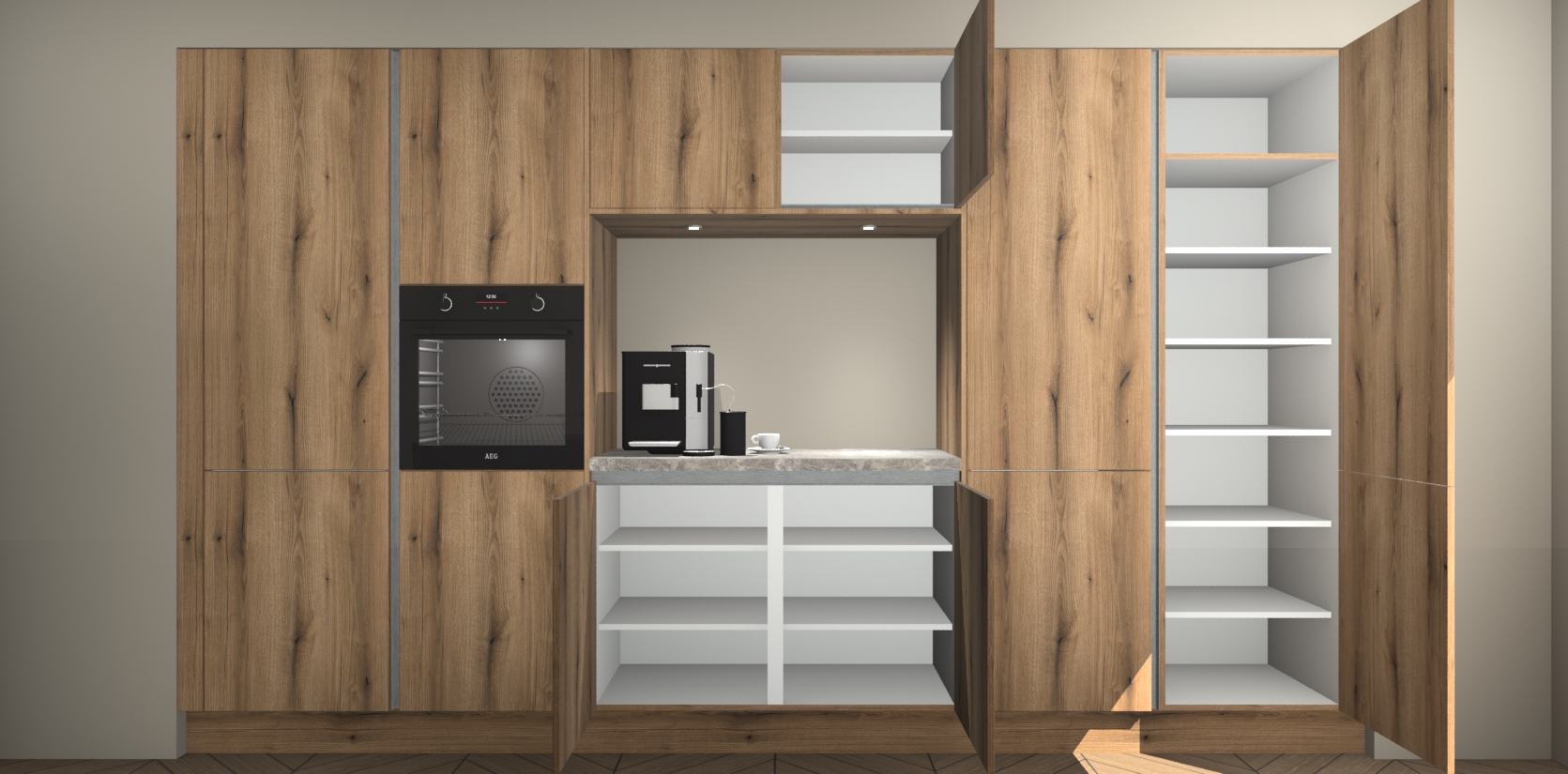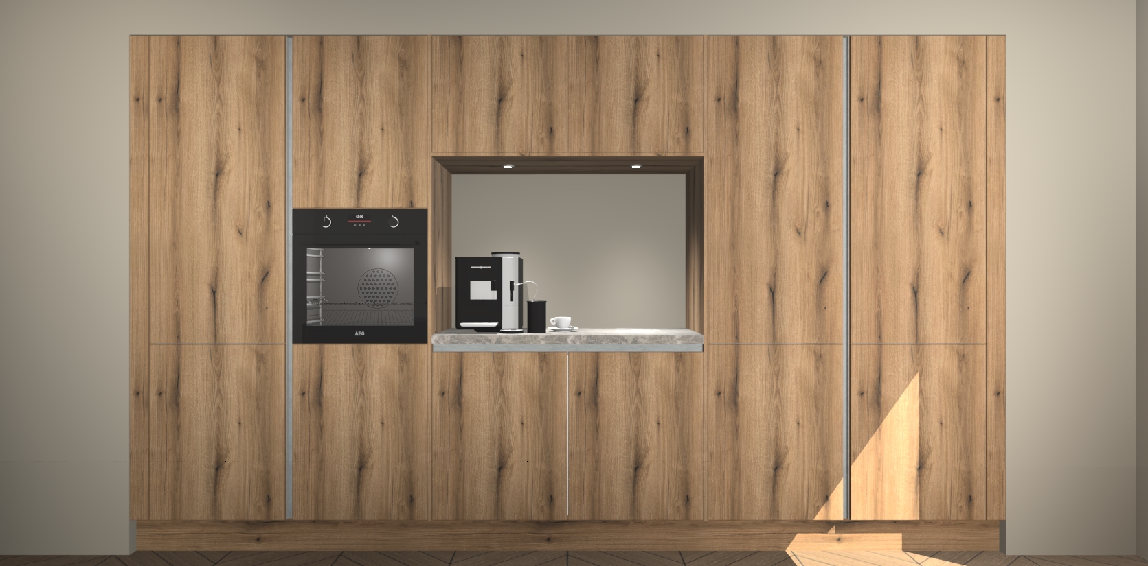 De Goud Eiken greeploze keuken Lodz wordt geleverd met een set van 5 ingebouwde apparaten: Een oven, inductiekookplaat, afzuigkap, vaatwasser en koelkast. Deze kunnen gemakkelijk worden opgewaardeerd naar AEG. Met de gegarandeerde lage prijs en de snelle levering van 7 weken kan u er op rekenen dat de Goud Eiken greeploze keuken Lodz zo snel mogelijk uw huis bereikt!