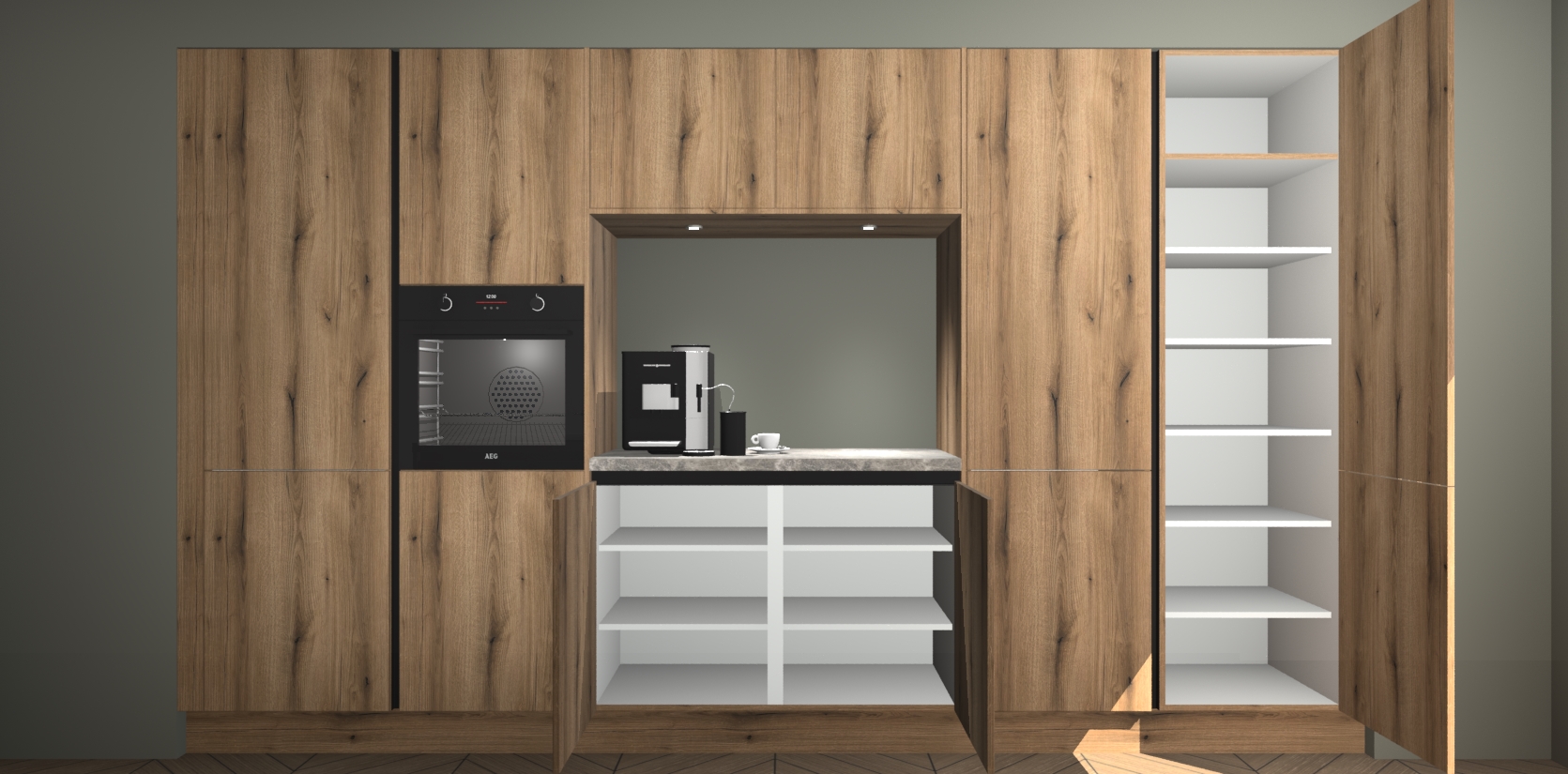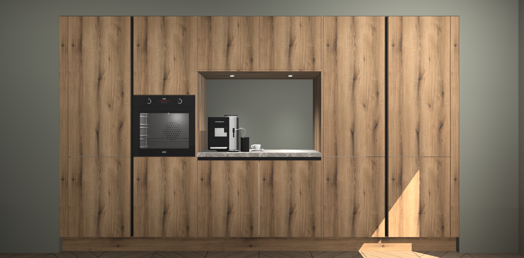 De Goud Eiken greeploze keuken Lodz wordt geleverd met een set van 5 ingebouwde apparaten: Een oven, inductiekookplaat, afzuigkap, vaatwasser en koelkast. Deze kunnen gemakkelijk worden opgewaardeerd naar AEG. Met de gegarandeerde lage prijs en de snelle levering van 7 weken kan u er op rekenen dat de Goud Eiken greeploze keuken Lodz zo snel mogelijk uw huis bereikt!