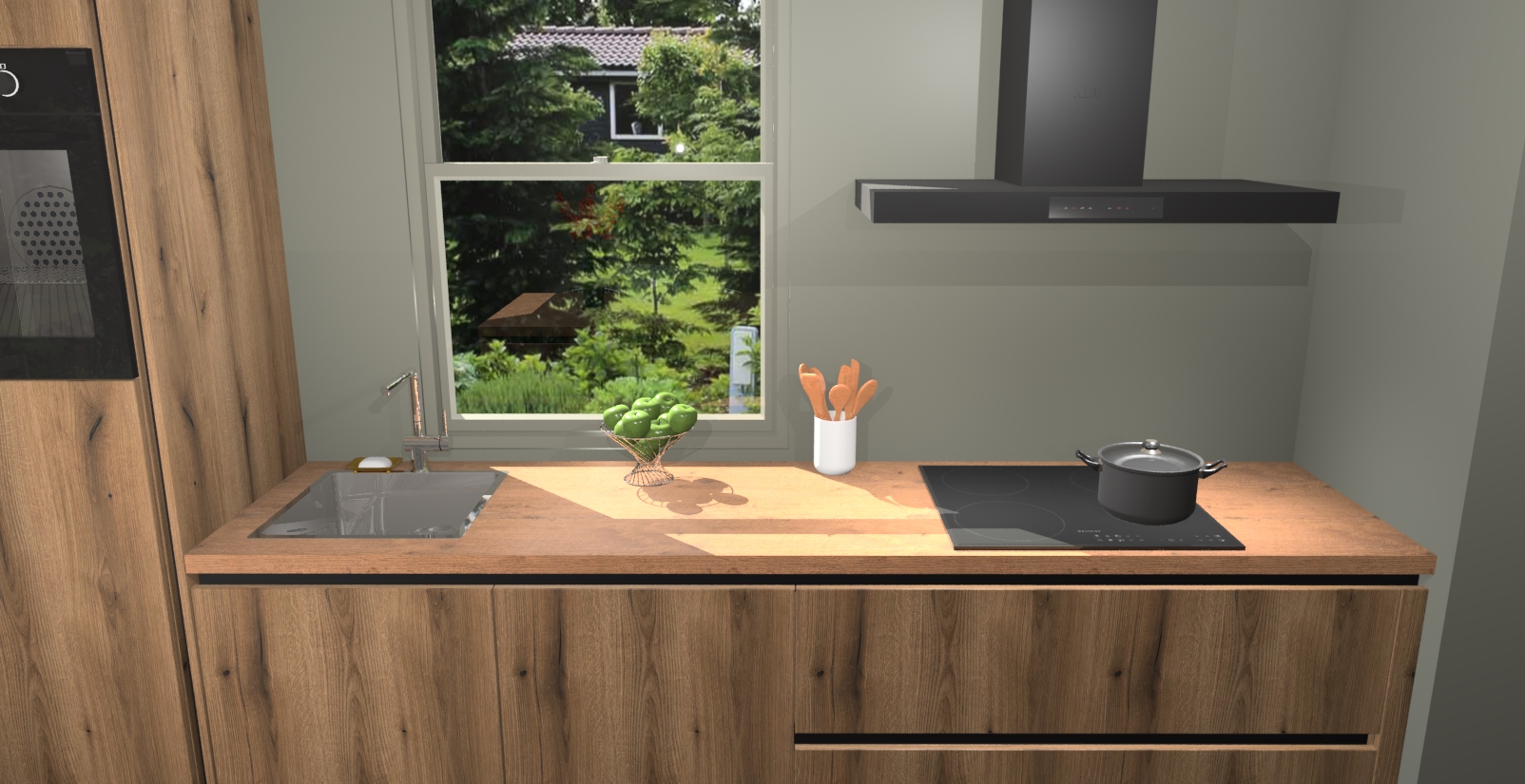Een stijlvolle en praktische keuken als deze mag gezien worden. Dankzij de prachtige Goud Eiken afwerking wordt de keuken gemakkelijk het middelpunt van uw huis - hij ziet er geweldig uit onder allerlei lichtomstandigheden, van dag tot nacht!