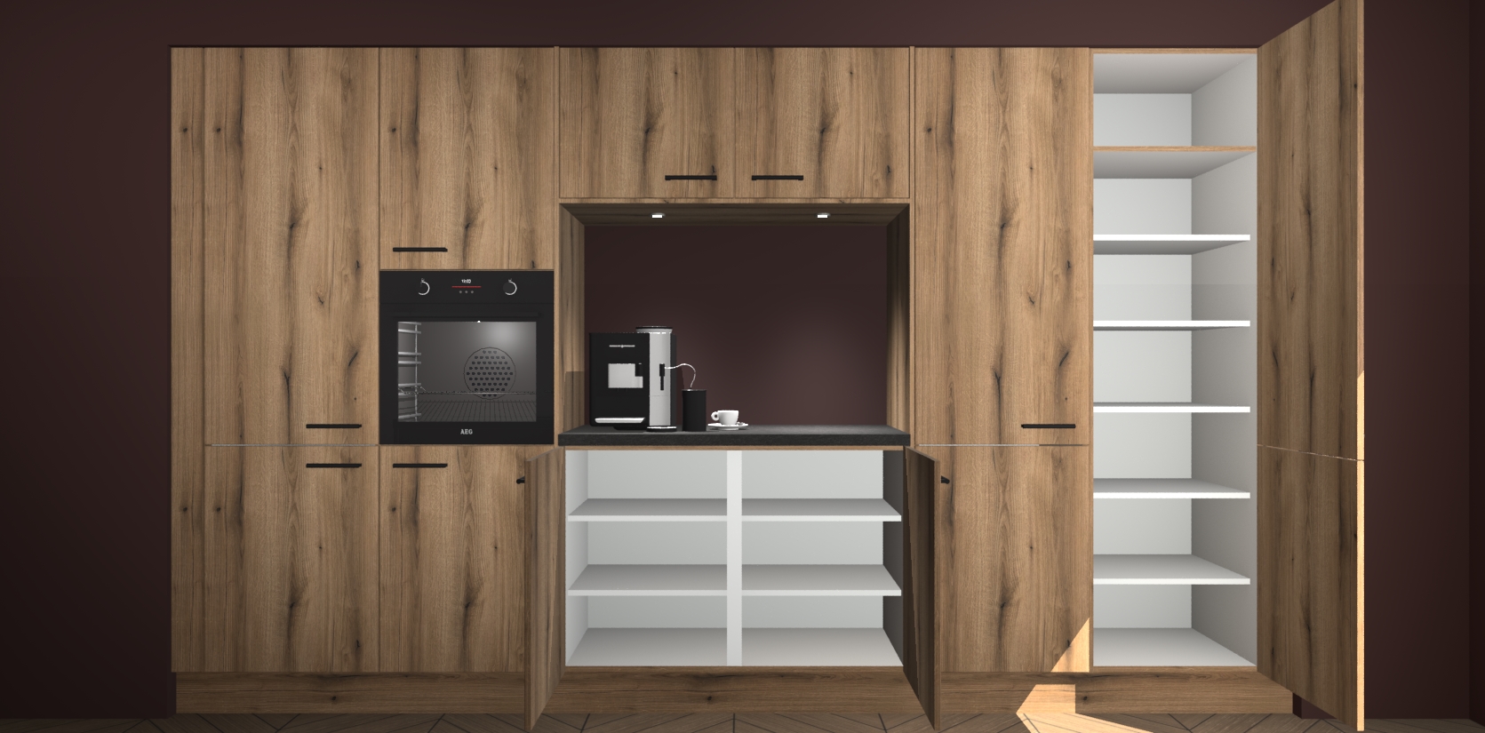 De Goud Eiken keuken Lodz wordt geleverd met een set van 5 ingebouwde apparaten: Een oven, inductiekookplaat, afzuigkap, vaatwasser en koelkast. Deze kunnen gemakkelijk worden opgewaardeerd naar AEG. Met de gegarandeerde lage prijs en de snelle levering van 7 weken kan u er op rekenen dat de Goud Eiken keuken Lodz zo snel mogelijk uw huis bereikt!