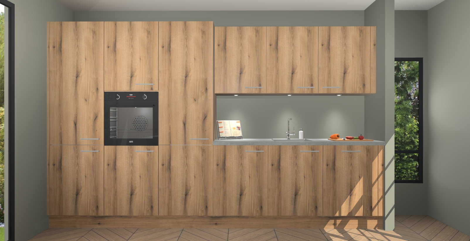 Maak kennis met de nieuwe Goud Eiken keuken Straatsburg, dat gemaakt is voor de moderne huiseigenaar. Deze chique en eigentijdse keuken geeft uw huis een instant upgrade. Het Goud Eiken ontwerp creëert de perfecte balans tussen elegantie en functionaliteit en geeft uw ruimte een strakke, uitnodigende sfeer. Het spoeleiland geeft ruime opbergruimte en met de soft-close deuren is deze keuken perfect voor elk huis.