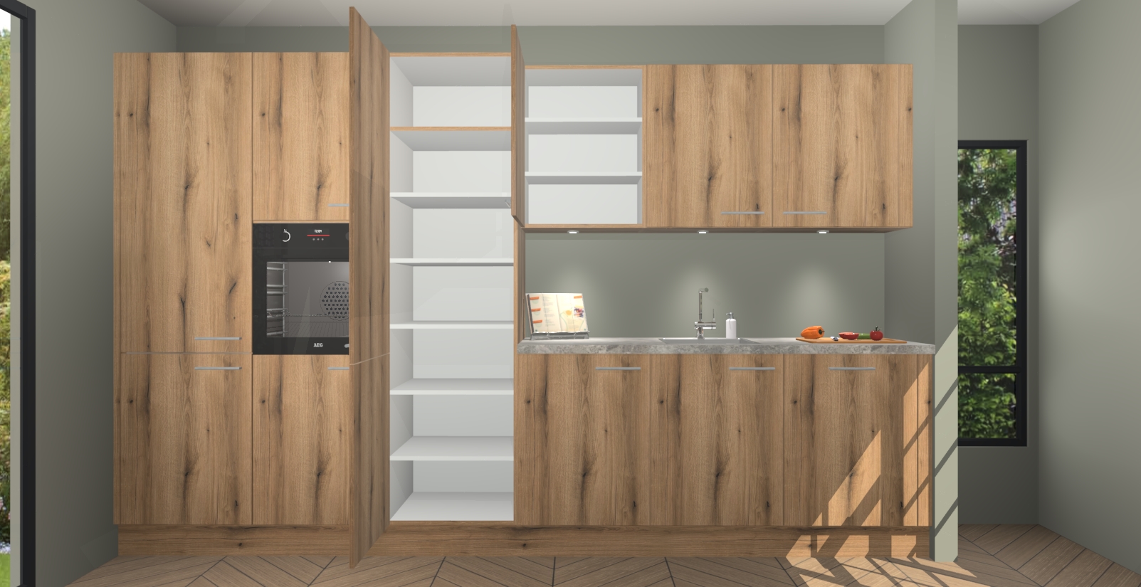 Maak kennis met de nieuwe Goud Eiken keuken Straatsburg, dat gemaakt is voor de moderne huiseigenaar. Deze chique en eigentijdse keuken geeft uw huis een instant upgrade. Het Goud Eiken ontwerp creëert de perfecte balans tussen elegantie en functionaliteit en geeft uw ruimte een strakke, uitnodigende sfeer. Het spoeleiland geeft ruime opbergruimte en met de soft-close deuren is deze keuken  perfect voor elk huis.