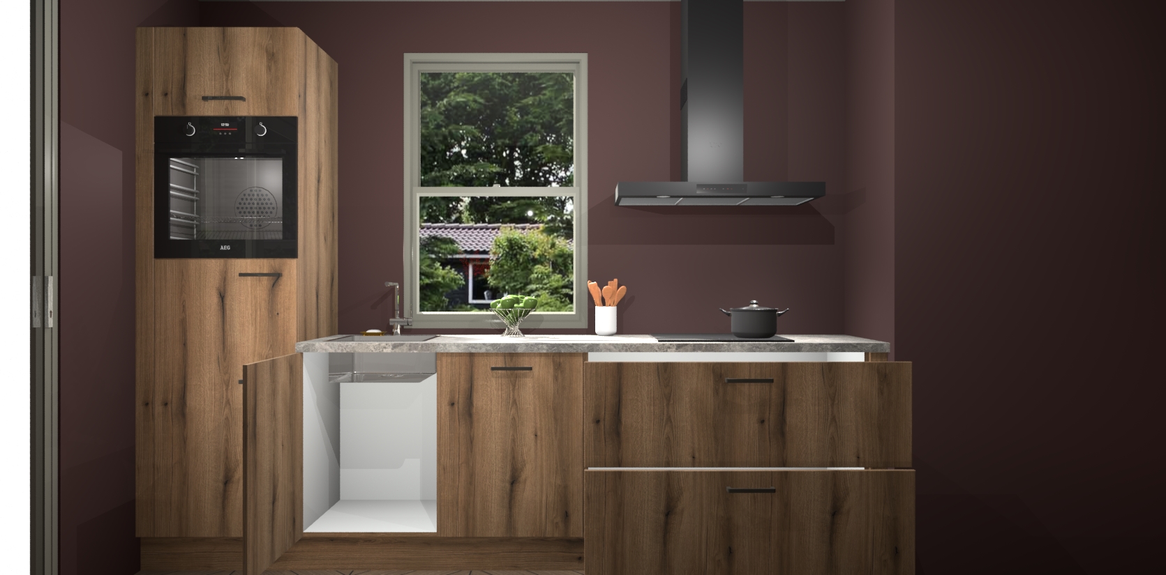 Dankzij de afwerking past de Goud Eiken keuken Toulouse naadloos in elk huis of appartement. De soft-close deuren geven je extra gemoedsrust, want ze sluiten vanzelf en slaan nooit dicht! En alsof dat nog niet genoeg is, worden deze kasten volledig gemonteerd geleverd, dus maak je geen zorgen over eventuele installatieproblemen.