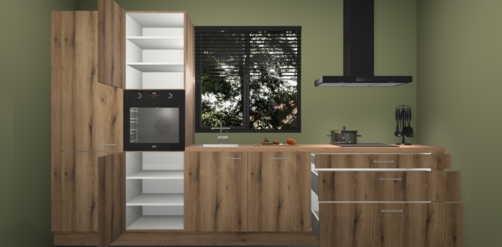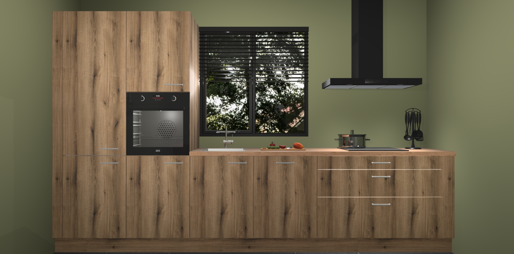 Maak kennis met de gouden eiken keuken Bonaire: de perfecte balans tussen tijdloos en modern. Met voldoende opbergruimte zal deze keuken de afgunst van uw vrienden en familie zijn, terwijl uw leven moeiteloos georganiseerd en rommelvrij blijft.
