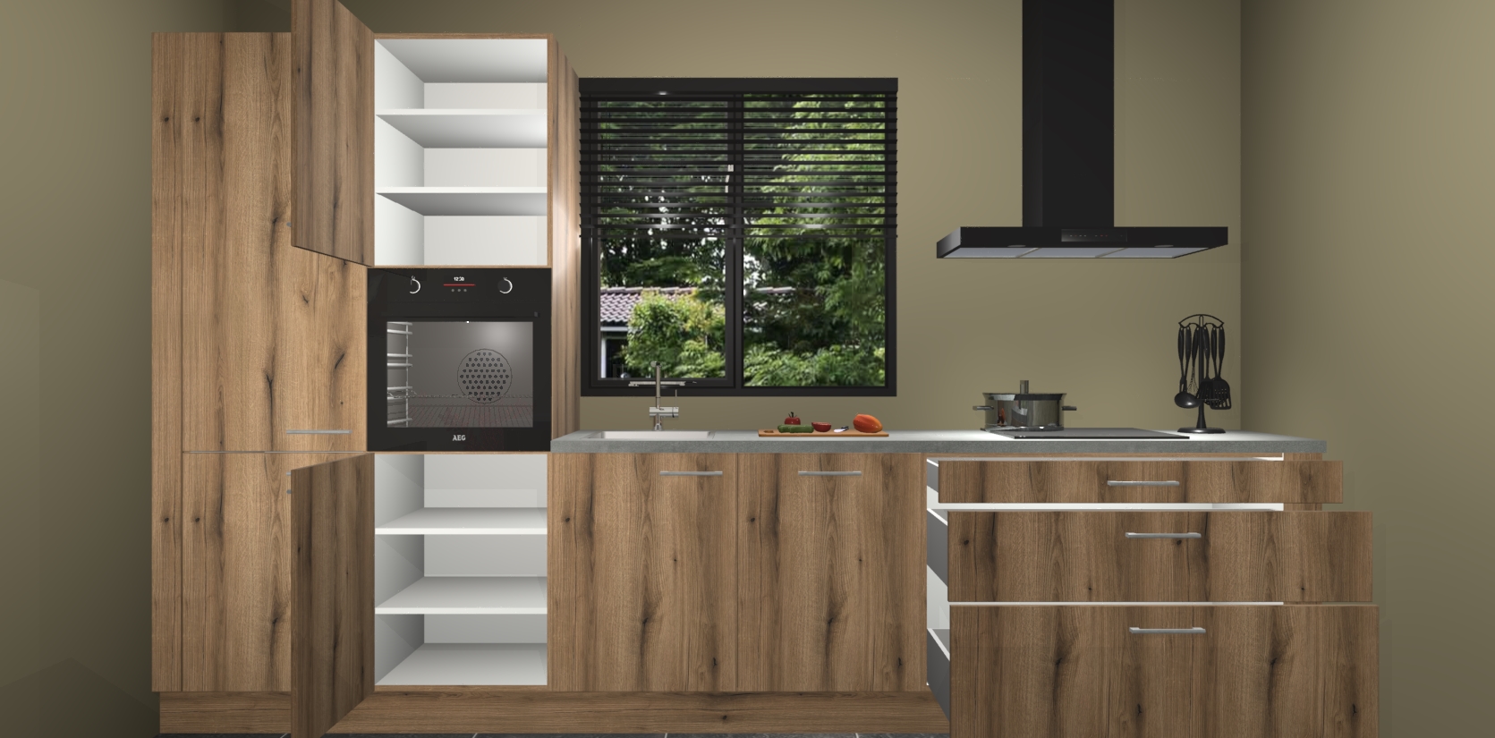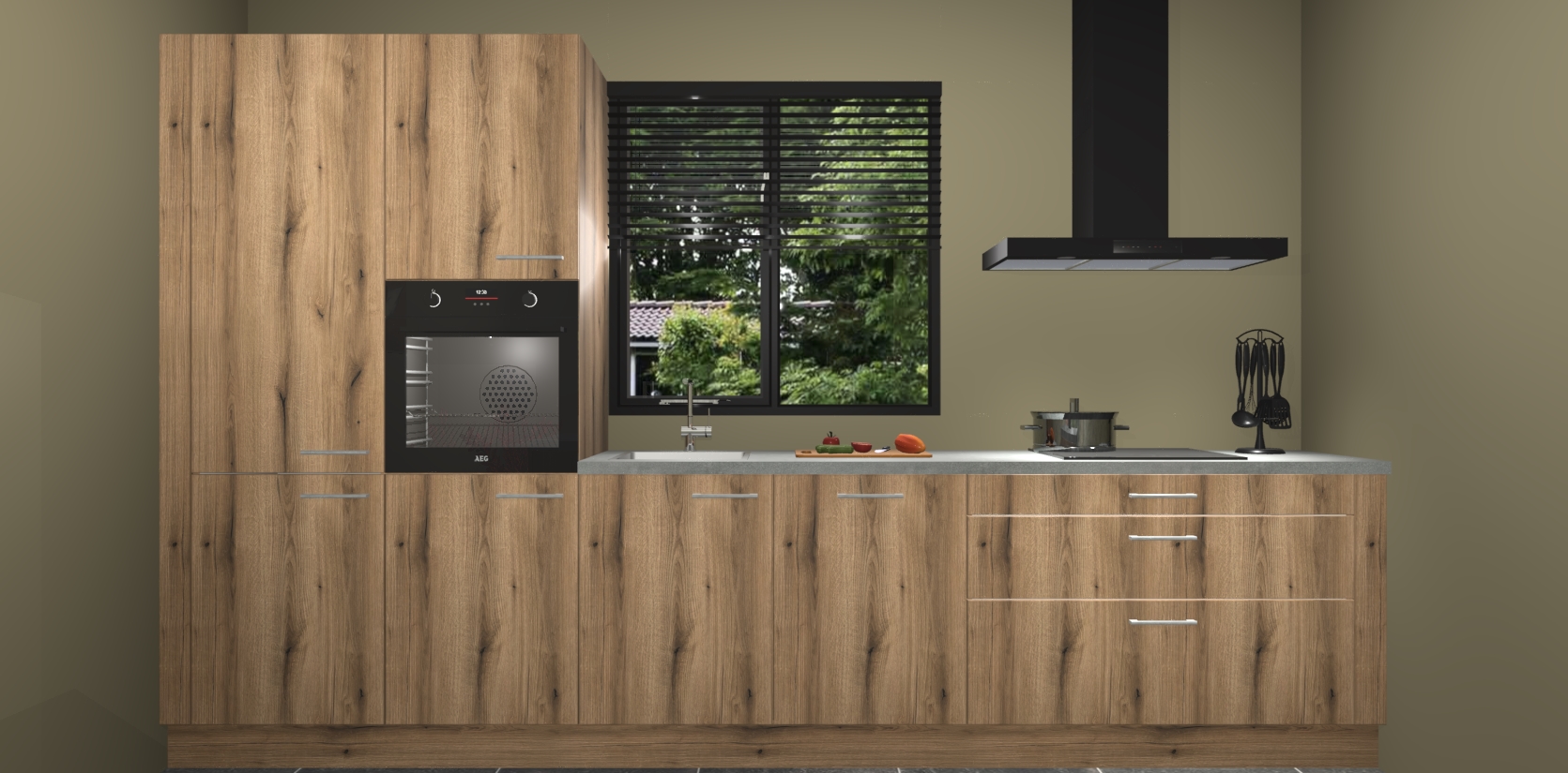 Maak kennis met de gouden eiken keuken Bonaire: de perfecte balans tussen tijdloos en modern. Met voldoende opbergruimte zal deze keuken de afgunst van uw vrienden en familie zijn, terwijl uw leven moeiteloos georganiseerd en rommelvrij blijft.