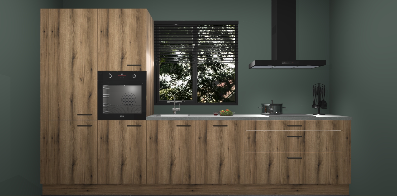 Maak kennis met de gouden eiken keuken Bonaire: de perfecte balans tussen tijdloos en modern. Met voldoende opbergruimte zal deze keuken de afgunst van uw vrienden en familie zijn, terwijl uw leven moeiteloos georganiseerd en rommelvrij blijft.
