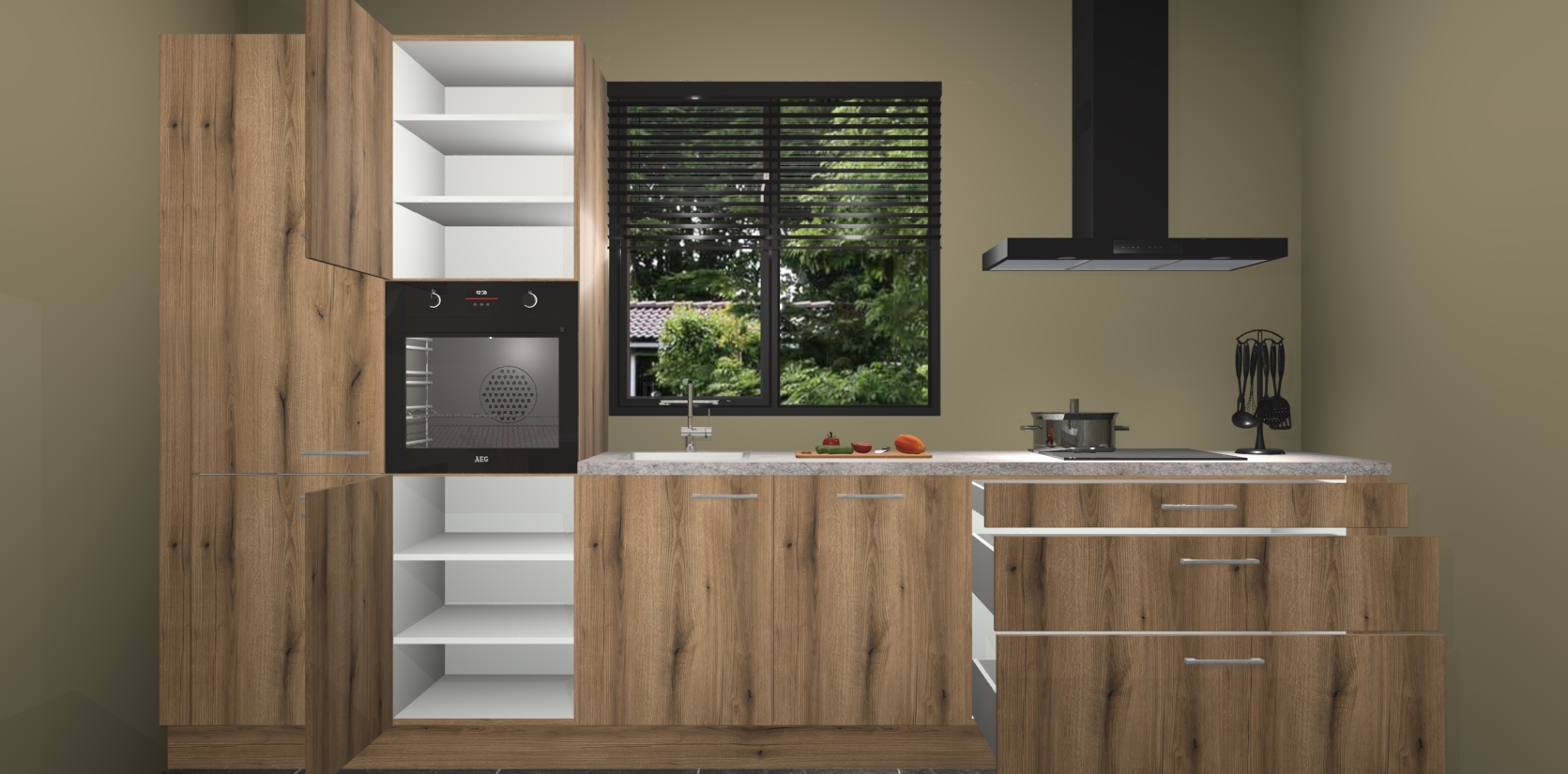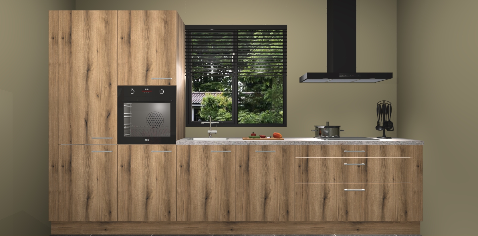 Maak kennis met de gouden eiken keuken Bonaire: de perfecte balans tussen tijdloos en modern. Met voldoende opbergruimte zal deze keuken de afgunst van uw vrienden en familie zijn, terwijl uw leven moeiteloos georganiseerd en rommelvrij blijft.