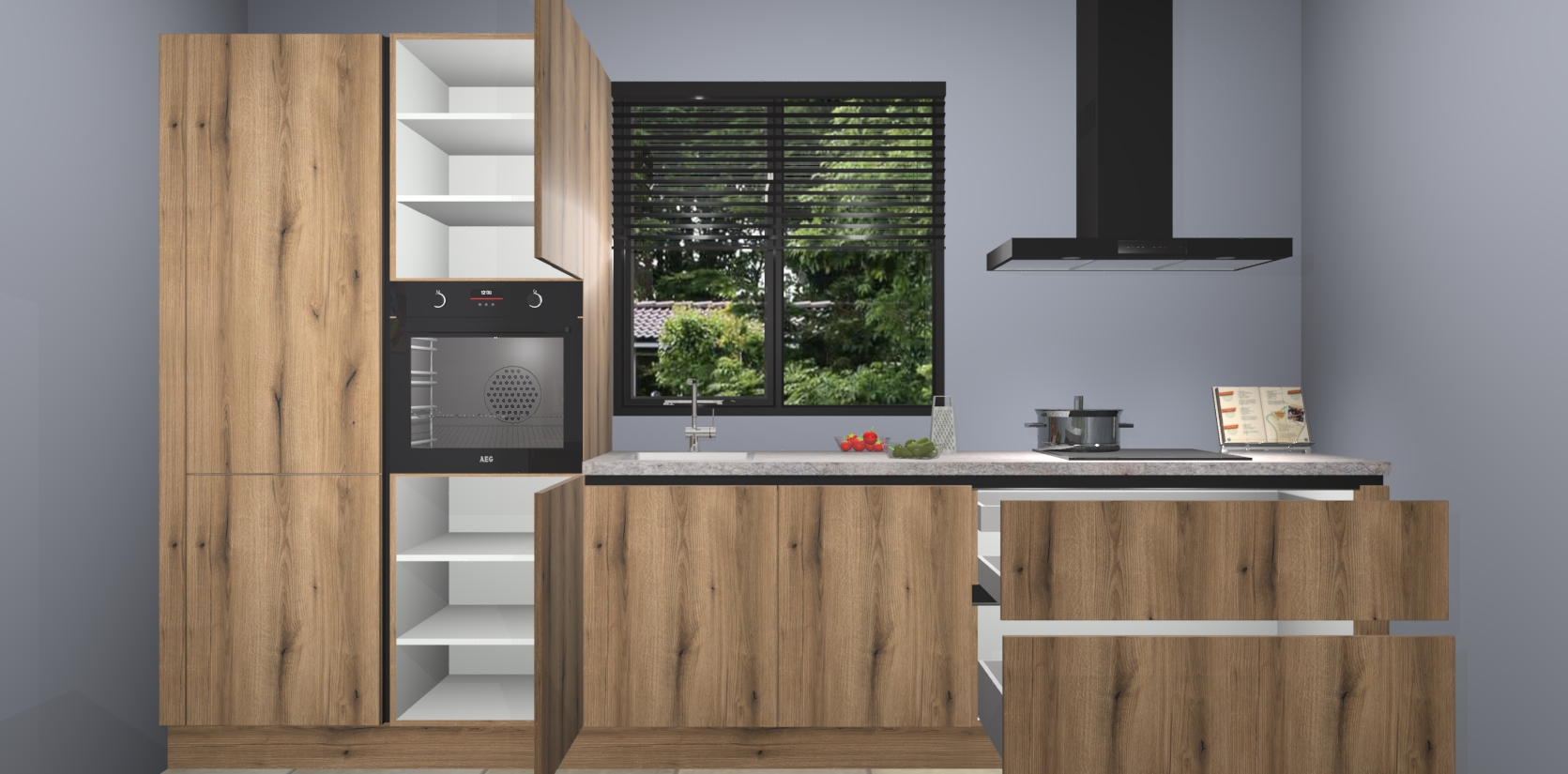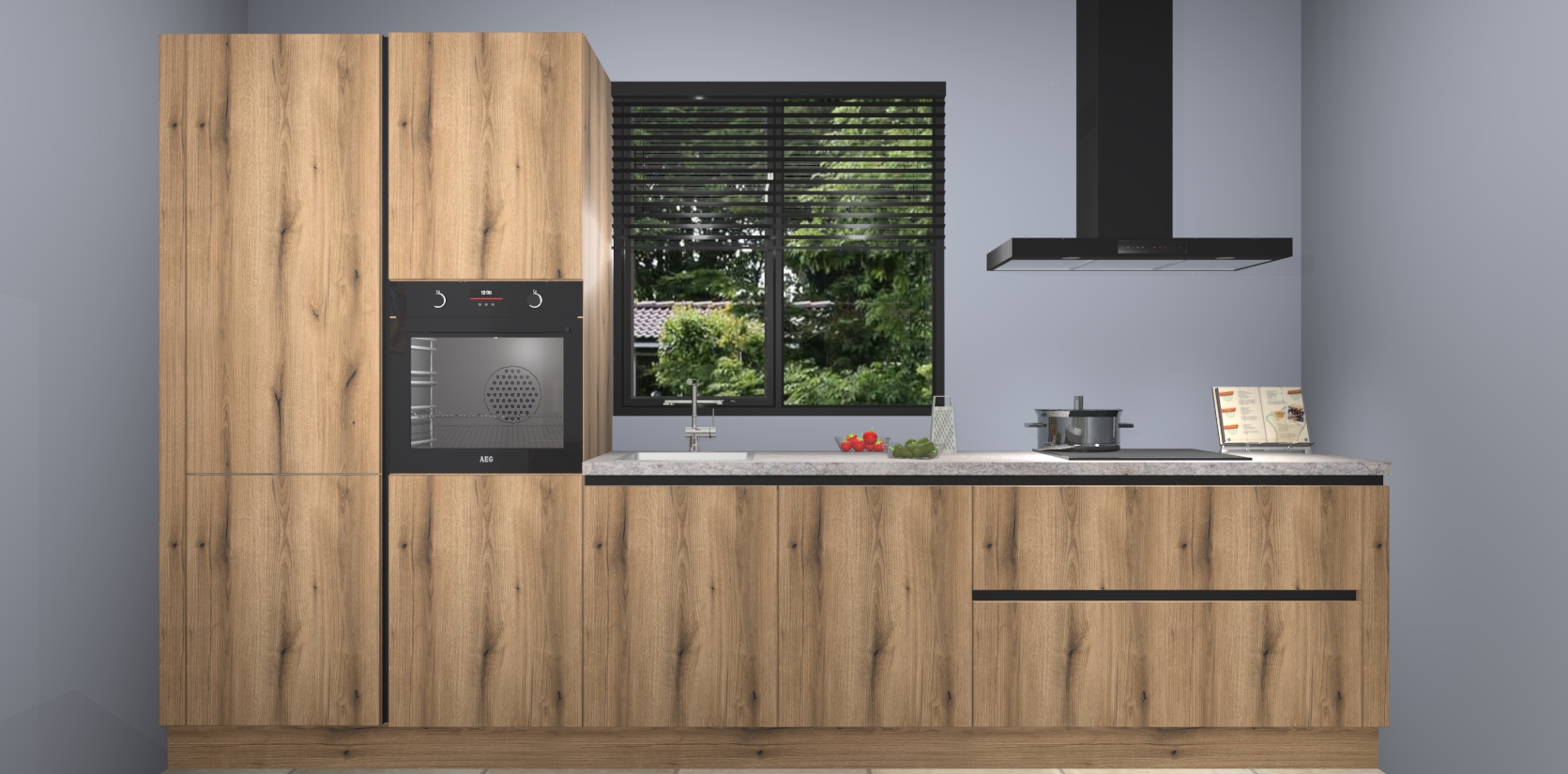 Maak kennis met de gouden eiken keuken Bonaire: de perfecte balans tussen tijdloos en modern. Met voldoende opbergruimte zal deze keuken de afgunst van uw vrienden en familie zijn, terwijl uw leven moeiteloos georganiseerd en rommelvrij blijft.