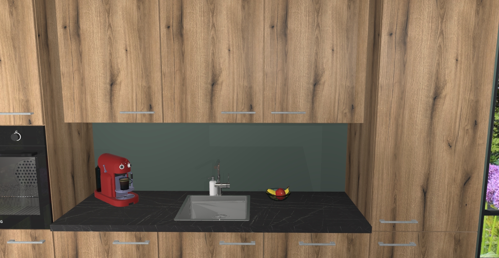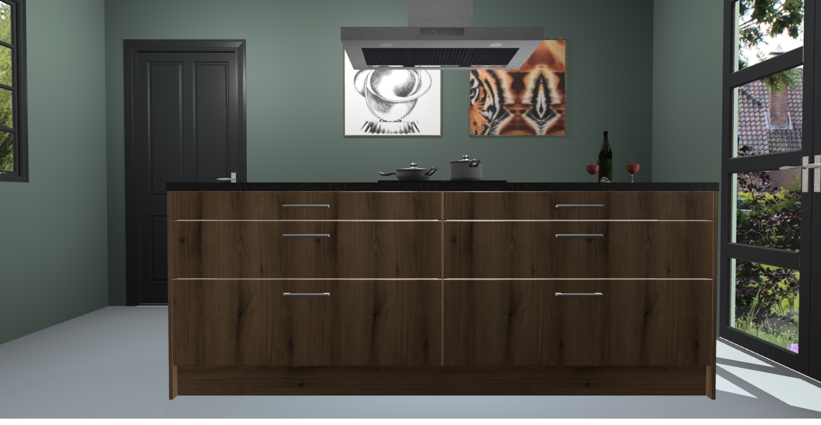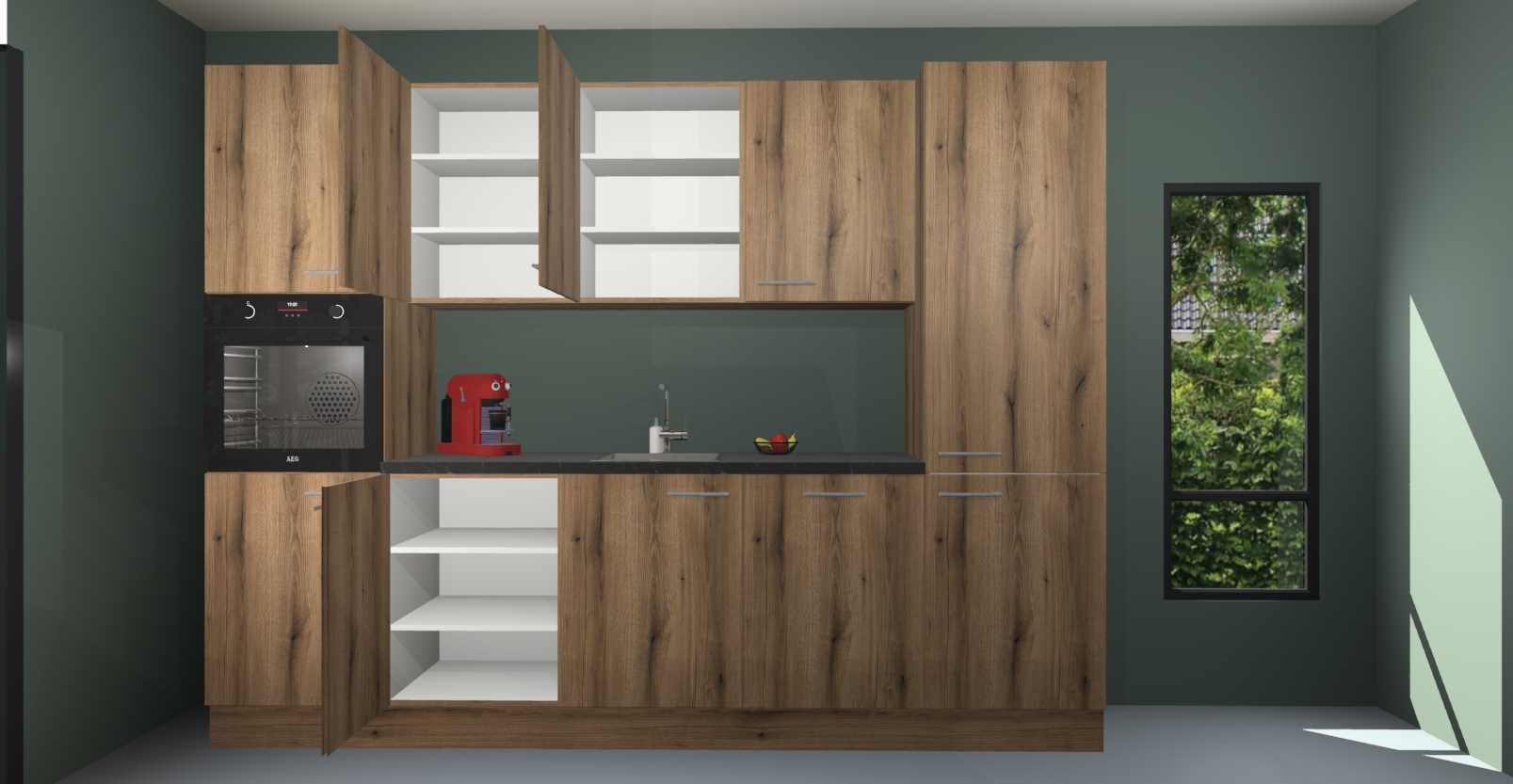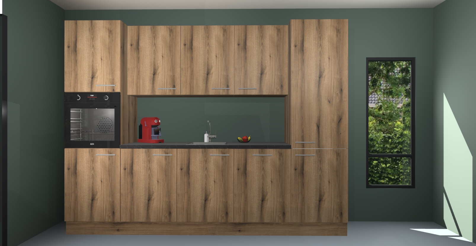Nog indrukwekkender zijn onze hypermoderne softclose deuren die voorkomen dat uw kastdeuren per ongeluk dichtslaan. Bovendien is de binnenkant van elke kast gecoat in dezelfde houten tinten voor een extra vleugje stijl en verfijning. Als dat nog niet geweldig genoeg is, bevat de keuken vijf inbouwapparaten: oven, inductieplaat, afzuigkap, vaatwasser en koelkast. En als gemak ook een prioriteit is, dan raden we u ten zeerste aan om te kiezen voor de update naar AEG. Dit kan gemakkelijk na het plaatsen van uw bestelling.