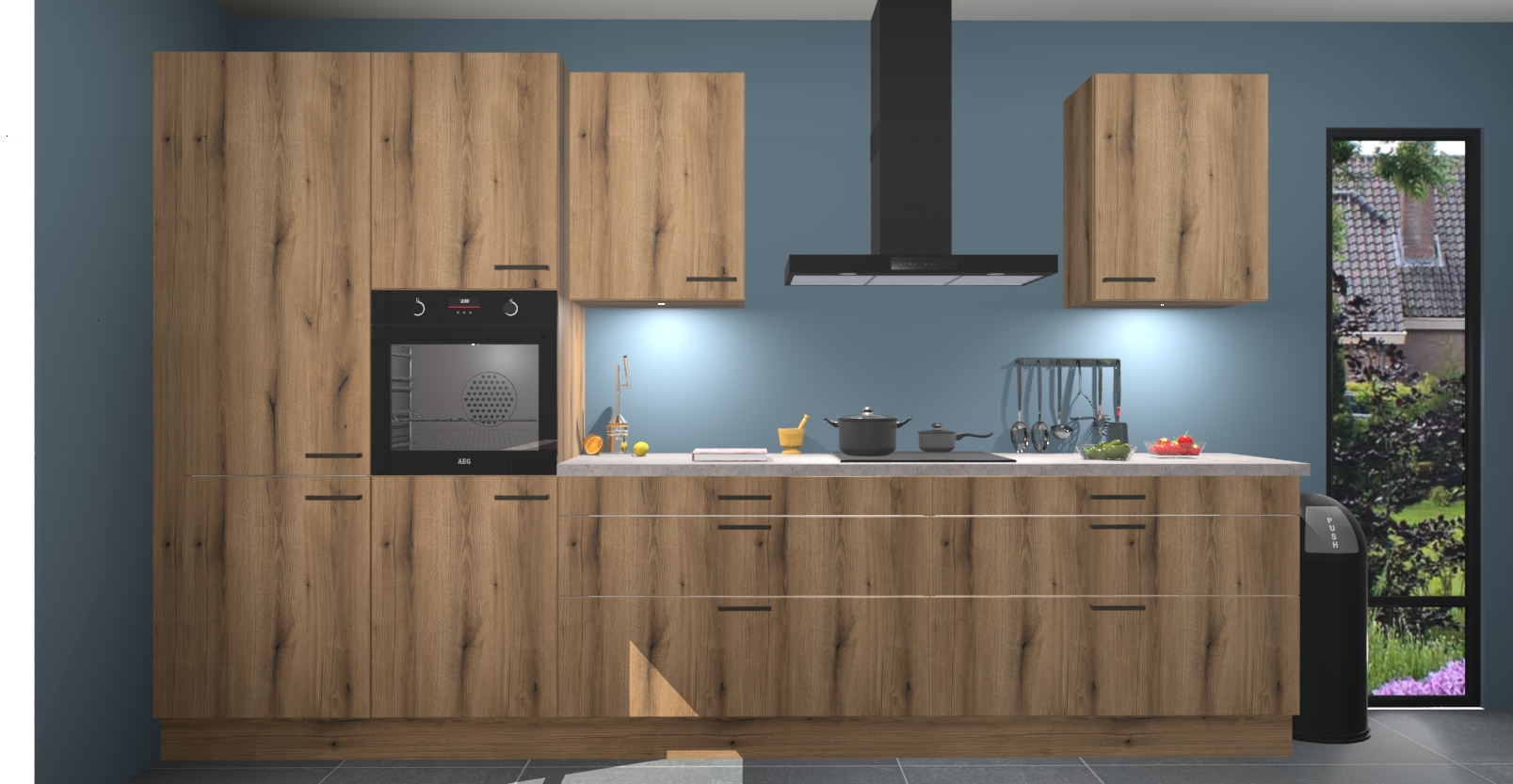 Klaar om een statement te maken in uw keuken? De Gouden eiken keuken Spanje is precies wat u nodig heeft. Dit moderne keuken ontwerp is de perfecte balans tussen esthetiek en functionaliteit in uw huis. Met een sfeervolle afwerking en voldoende opbergruimte kan u er zeker van zijn dat u heerlijke maaltijden bereidt en ze in uw keuken kan bewaren voor de dagen dat u het te druk hebt. Bovendien voegt het mooie spoeleiland een element van klasse en gemak toe aan uw keuken.