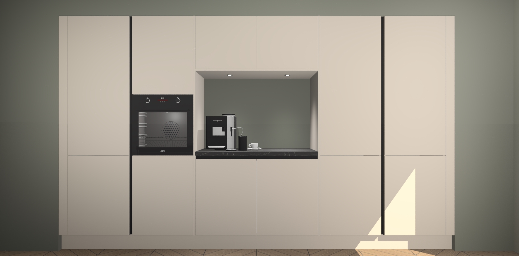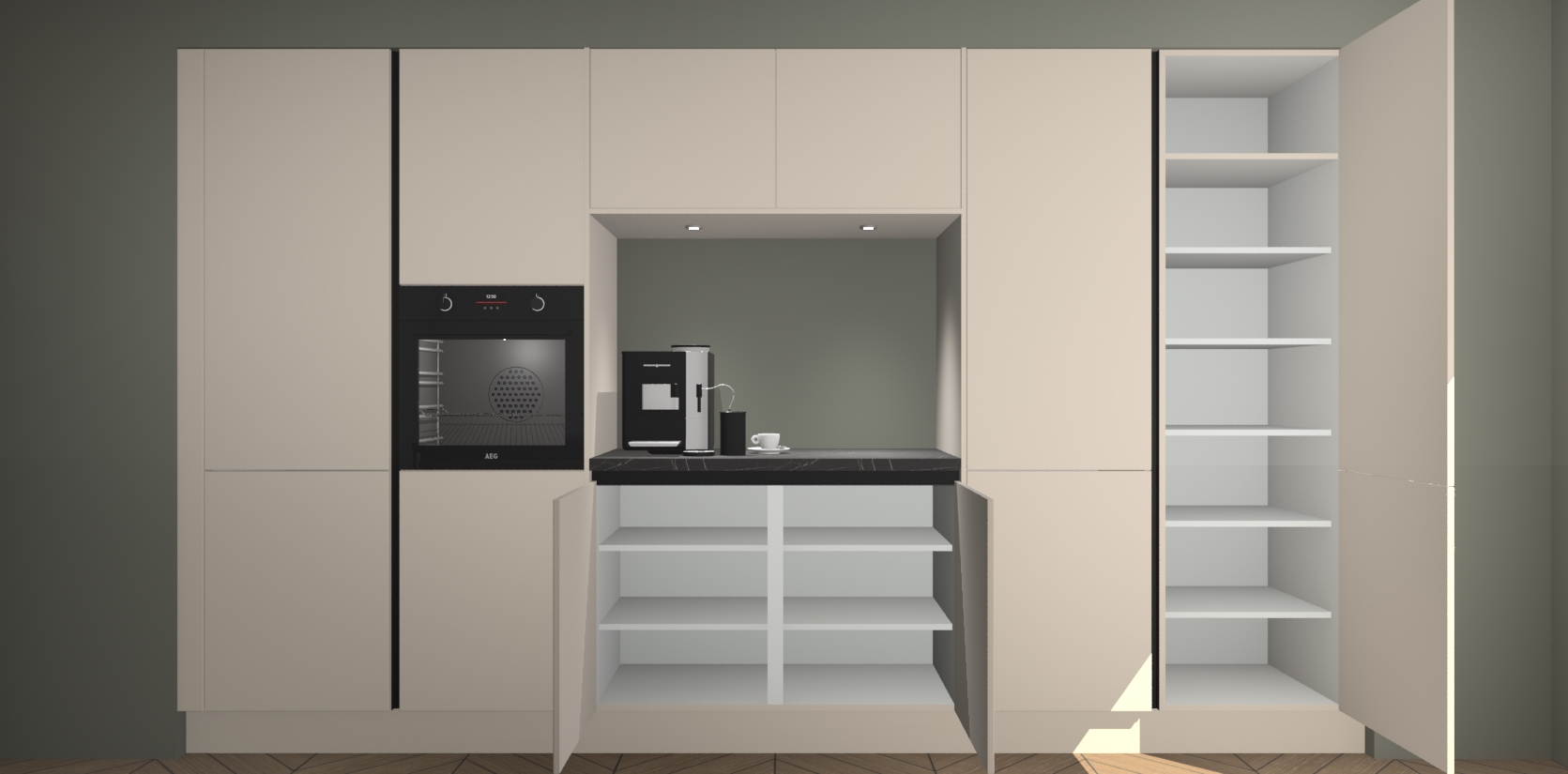 De Kasjmier greeploze keuken Lodz wordt geleverd met een set van 5 ingebouwde apparaten: Een oven, inductiekookplaat, afzuigkap, vaatwasser en koelkast. Deze kunnen gemakkelijk worden opgewaardeerd naar AEG. Met de gegarandeerde lage prijs en de snelle levering van 7 weken kan u er op rekenen dat de Kasjmier greeploze keuken Lodz zo snel mogelijk uw huis bereikt!