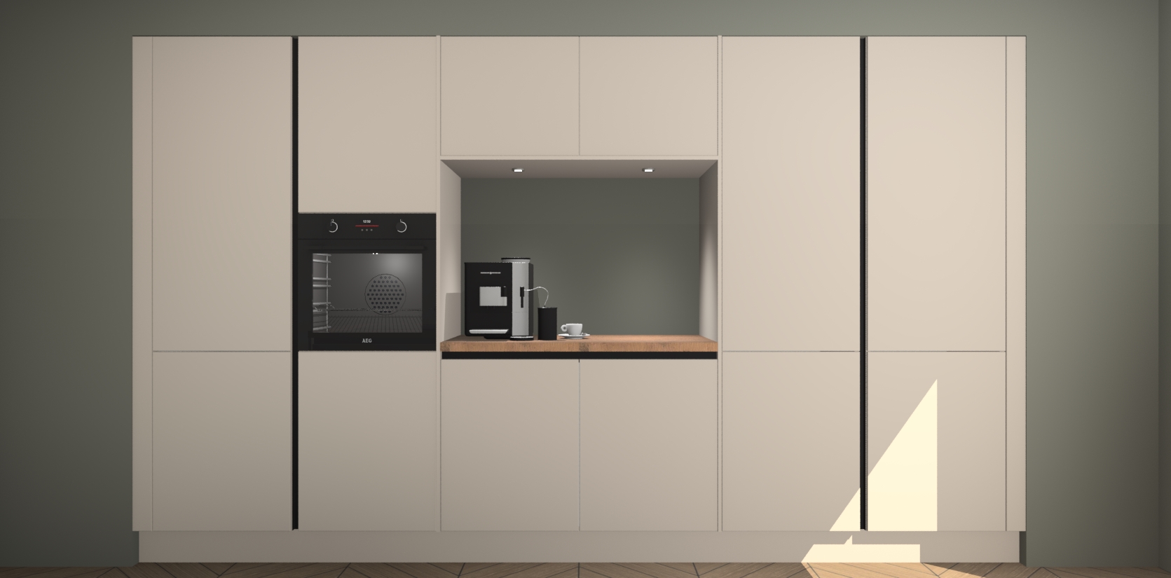 De Kasjmier greeploze keuken Lodz wordt geleverd met een set van 5 ingebouwde apparaten: Een oven, inductiekookplaat, afzuigkap, vaatwasser en koelkast. Deze kunnen gemakkelijk worden opgewaardeerd naar AEG. Met de gegarandeerde lage prijs en de snelle levering van 7 weken kan u er op rekenen dat de Kasjmier greeploze keuken Lodz zo snel mogelijk uw huis bereikt!