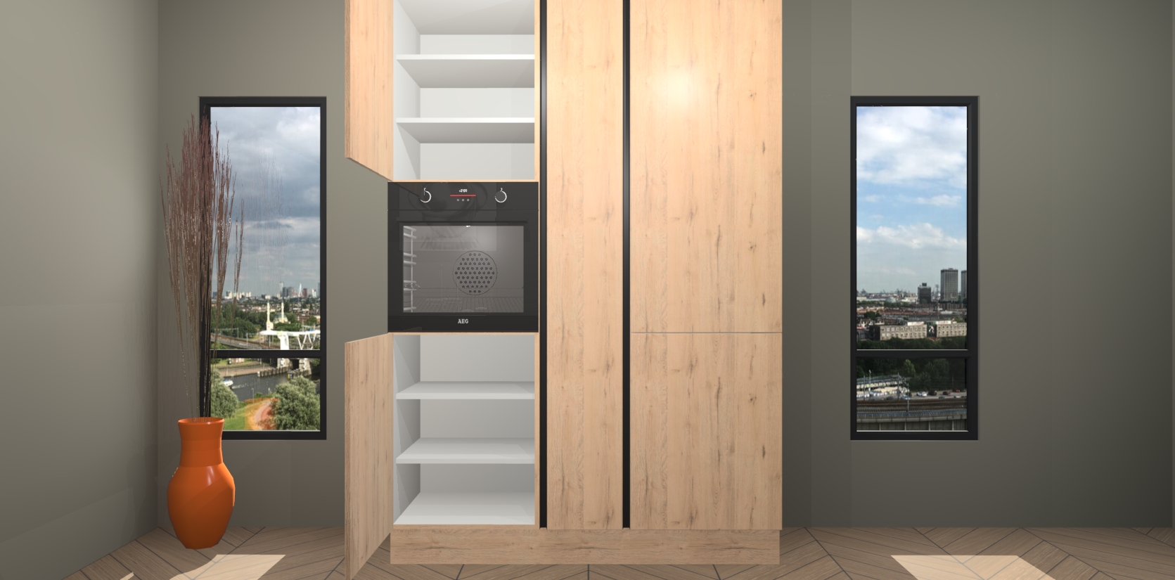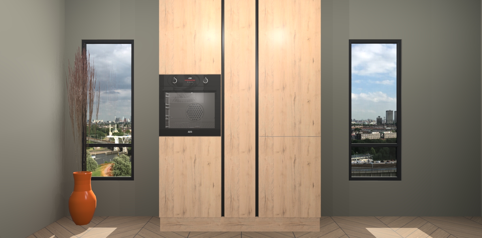 De madera natuur greeploze keuken Jeddah bevat 5 inbouwapparaten - een oven, inductiekookplaat, afzuigkap, vaatwasser en koelkast - die u na bestelling kunt upgraden naar AEG. Deze softclose deuren bieden een perfecte afwerking om uw keukendroom compleet te maken.