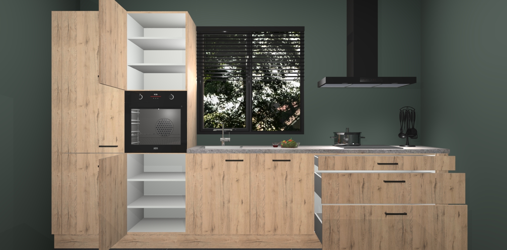 Maak kennis met de madera natuur keuken Bonaire: de perfecte balans tussen tijdloos en modern. Met voldoende opbergruimte zal deze keuken de afgunst van uw vrienden en familie zijn, terwijl uw leven moeiteloos georganiseerd en rommelvrij blijft.