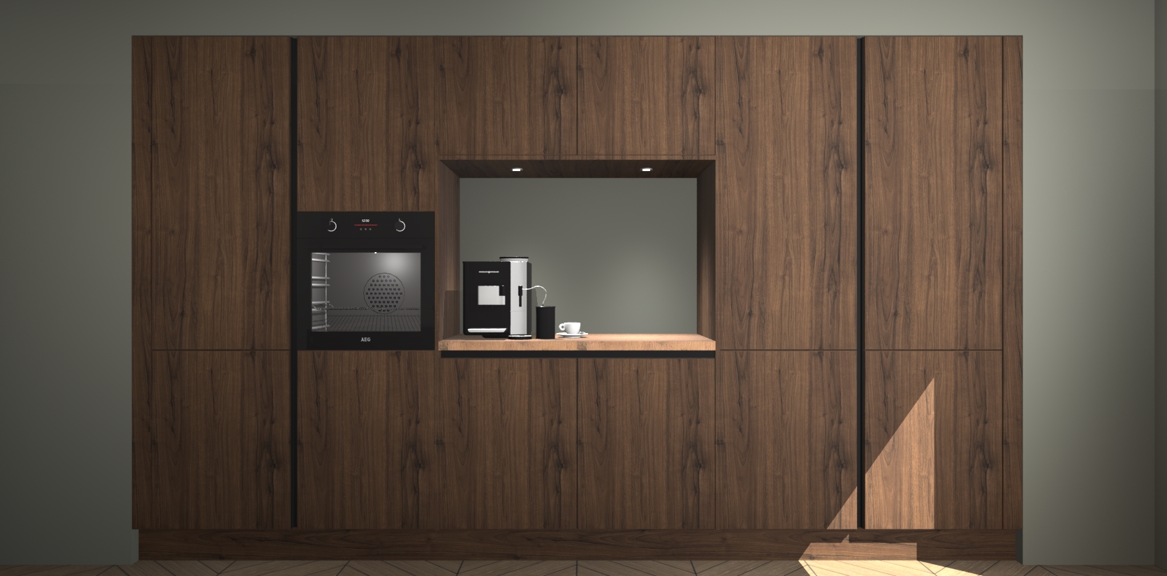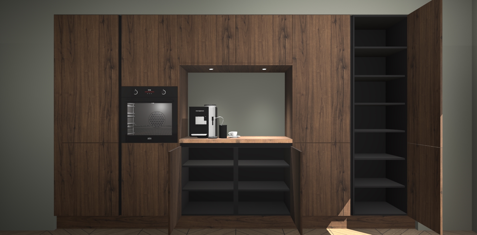 De Noten greeploze keuken Lodz wordt geleverd met een set van 5 ingebouwde apparaten: Een oven, inductiekookplaat, afzuigkap, vaatwasser en koelkast. Deze kunnen gemakkelijk worden opgewaardeerd naar AEG. Met de gegarandeerde lage prijs en de snelle levering van 7 weken kan u er op rekenen dat de Noten greeploze keuken Lodz zo snel mogelijk uw huis bereikt!