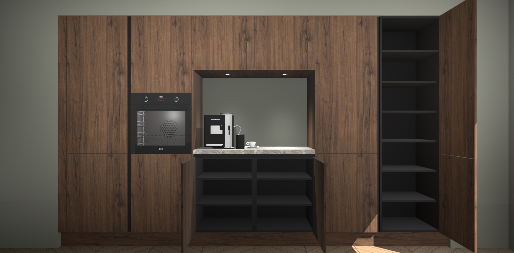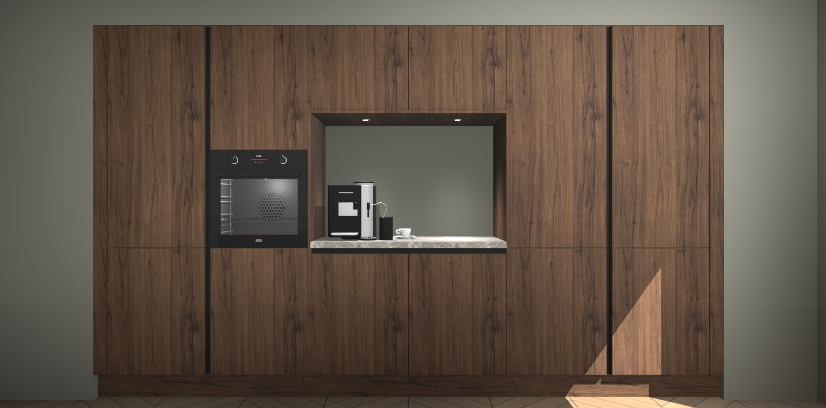 De Noten greeploze keuken Lodz wordt geleverd met een set van 5 ingebouwde apparaten: Een oven, inductiekookplaat, afzuigkap, vaatwasser en koelkast. Deze kunnen gemakkelijk worden opgewaardeerd naar AEG. Met de gegarandeerde lage prijs en de snelle levering van 7 weken kan u er op rekenen dat de Noten greeploze keuken Lodz zo snel mogelijk uw huis bereikt!