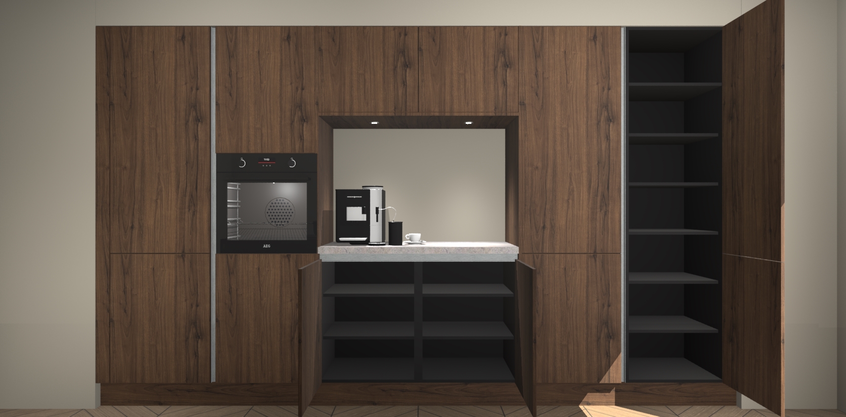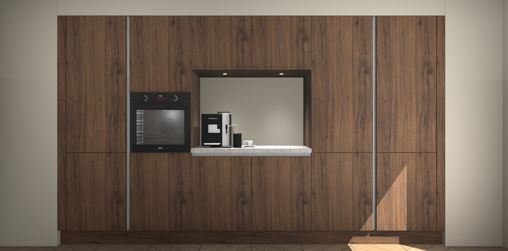 De Noten greeploze keuken Lodz wordt geleverd met een set van 5 ingebouwde apparaten: Een oven, inductiekookplaat, afzuigkap, vaatwasser en koelkast. Deze kunnen gemakkelijk worden opgewaardeerd naar AEG. Met de gegarandeerde lage prijs en de snelle levering van 7 weken kan u er op rekenen dat de Noten greeploze keuken Lodz zo snel mogelijk uw huis bereikt!