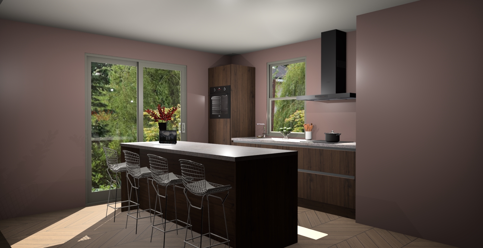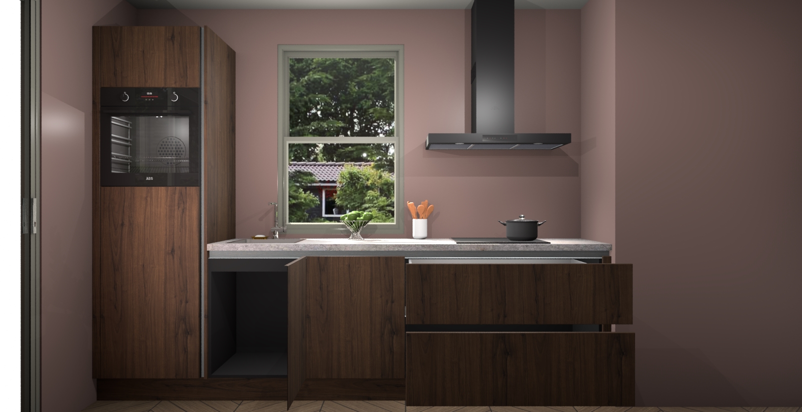 Een stijlvolle en praktische keuken als deze mag gezien worden. Dankzij de prachtige Noten afwerking wordt de keuken gemakkelijk het middelpunt van uw huis - hij ziet er geweldig uit onder allerlei lichtomstandigheden, van dag tot nacht!