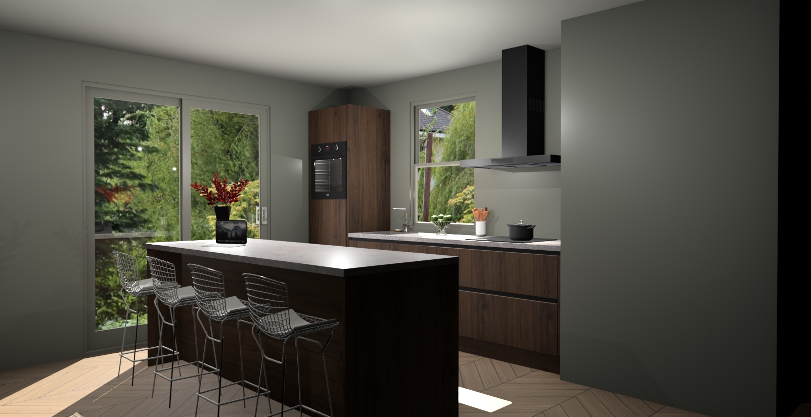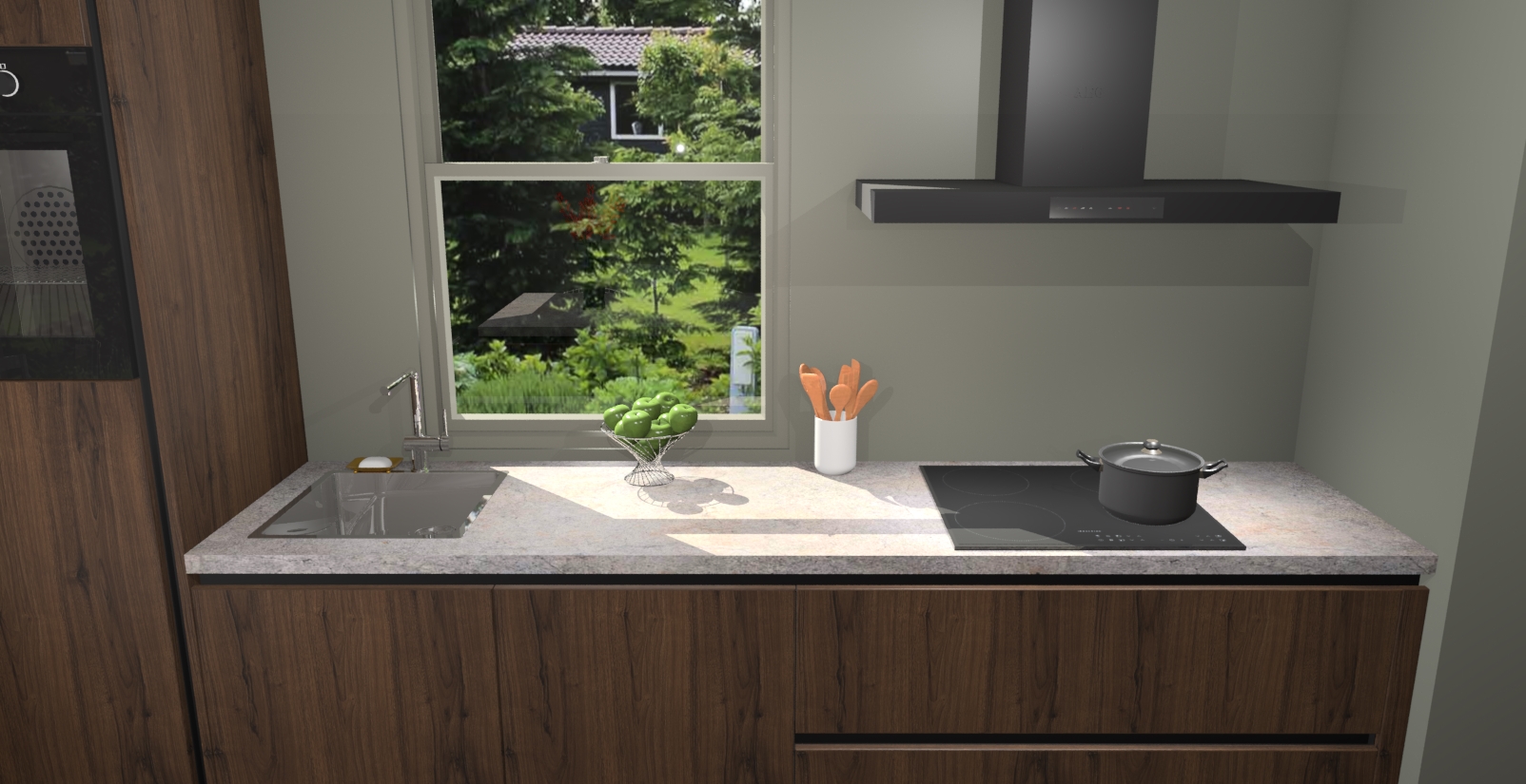 Een stijlvolle en praktische keuken als deze mag gezien worden. Dankzij de prachtige Noten afwerking wordt de keuken gemakkelijk het middelpunt van uw huis - hij ziet er geweldig uit onder allerlei lichtomstandigheden, van dag tot nacht!