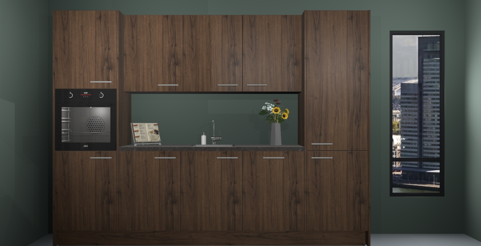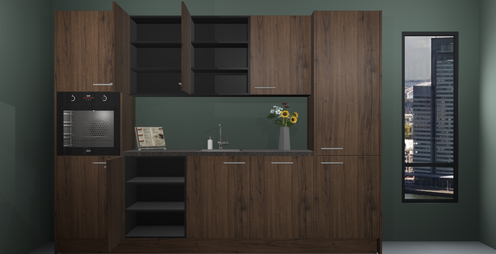 Nog indrukwekkender zijn onze hypermoderne softclose deuren die voorkomen dat uw kastdeuren per ongeluk dichtslaan. Bovendien is de binnenkant van elke kast gecoat in dezelfde houten tinten voor een extra vleugje stijl en verfijning. Als dat nog niet geweldig genoeg is, bevat de keuken vijf inbouwapparaten: oven, inductieplaat, afzuigkap, vaatwasser en koelkast. En als gemak ook een prioriteit is, dan raden we u ten zeerste aan om te kiezen voor de update naar AEG. Dit kan gemakkelijk na het plaatsen van uw bestelling.