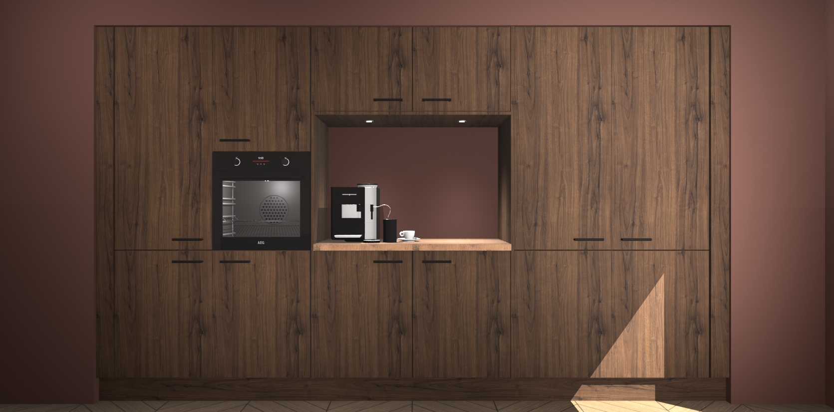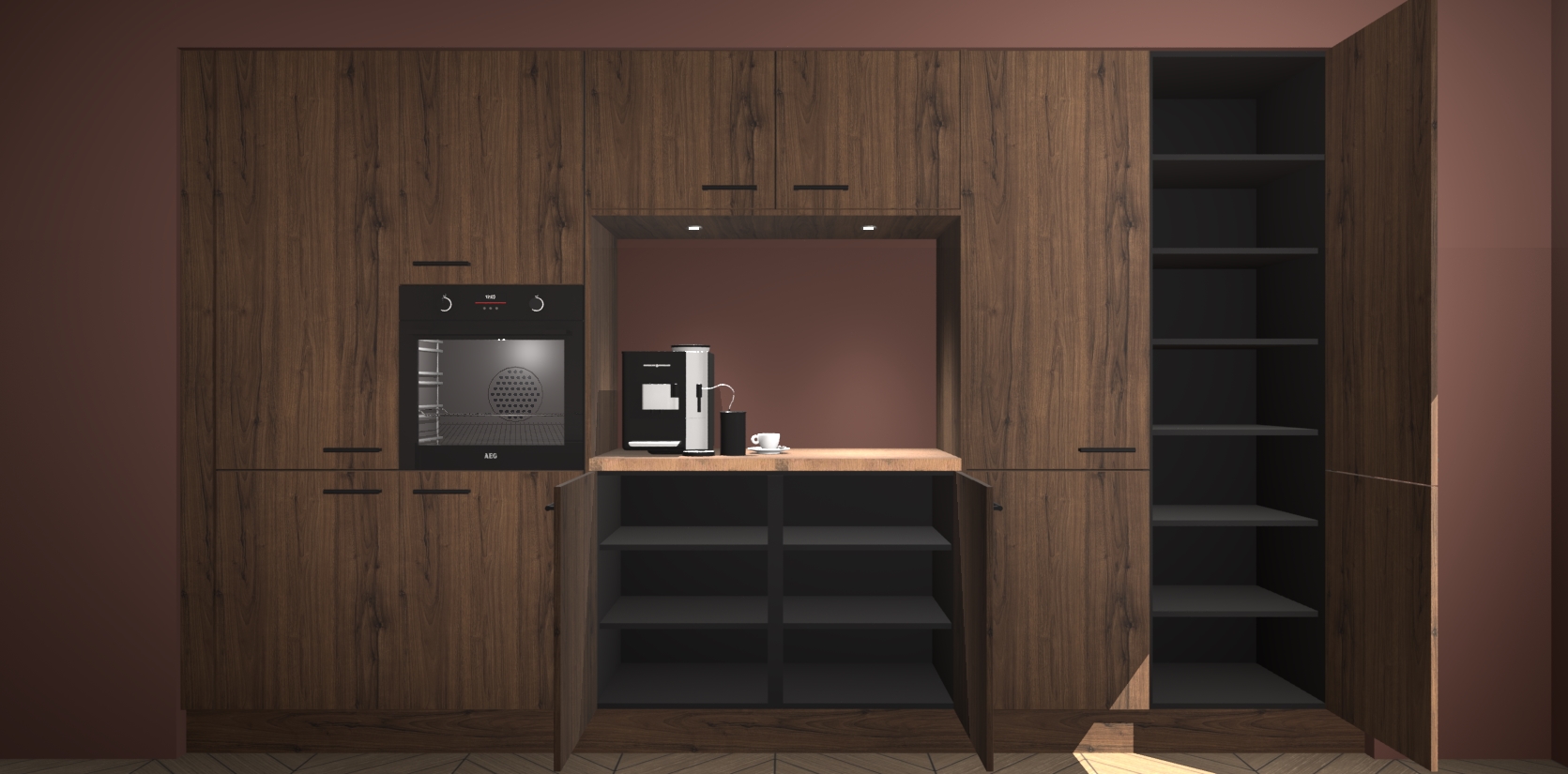 De Noten keuken Lodz wordt geleverd met een set van 5 ingebouwde apparaten: Een oven, inductiekookplaat, afzuigkap, vaatwasser en koelkast. Deze kunnen gemakkelijk worden opgewaardeerd naar AEG. Met de gegarandeerde lage prijs en de snelle levering van 7 weken kan u er op rekenen dat de Noten keuken Lodz zo snel mogelijk uw huis bereikt!