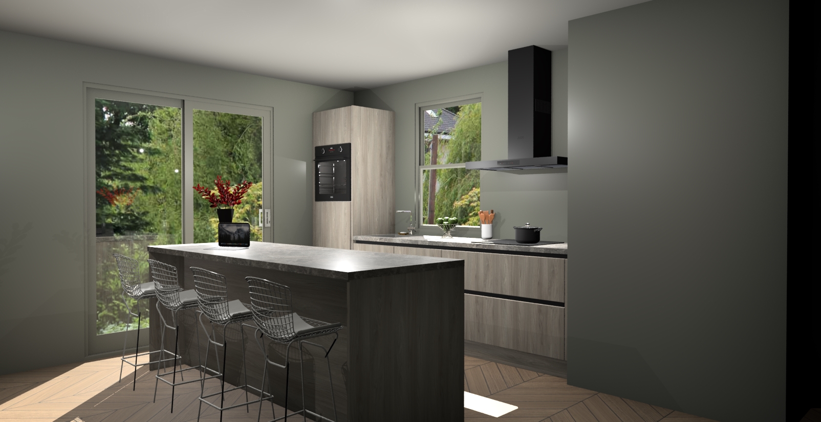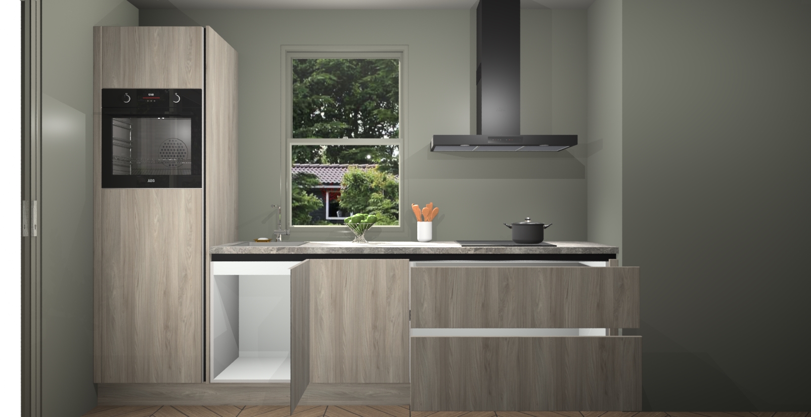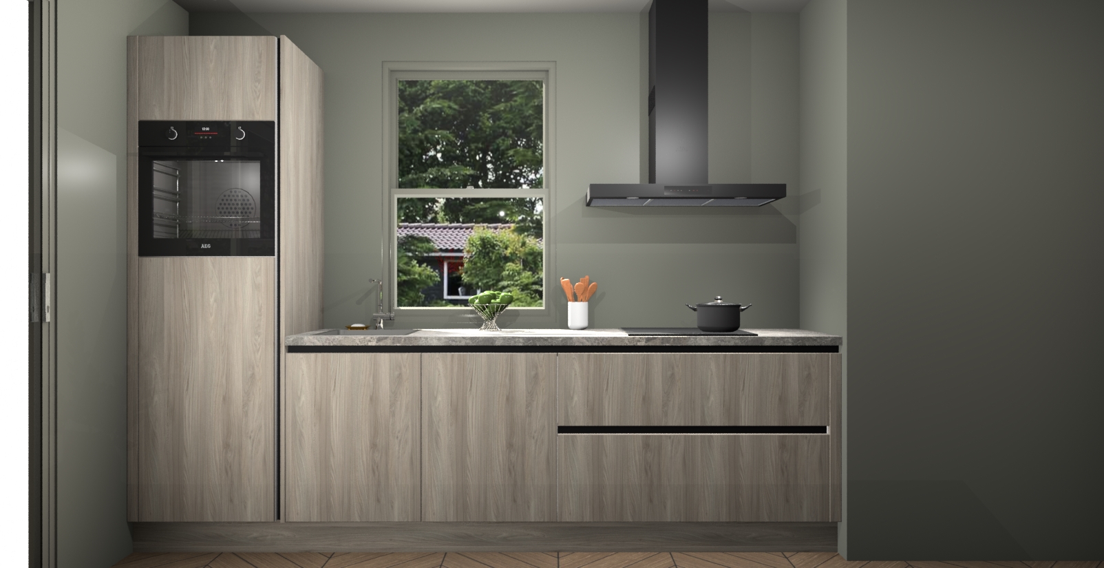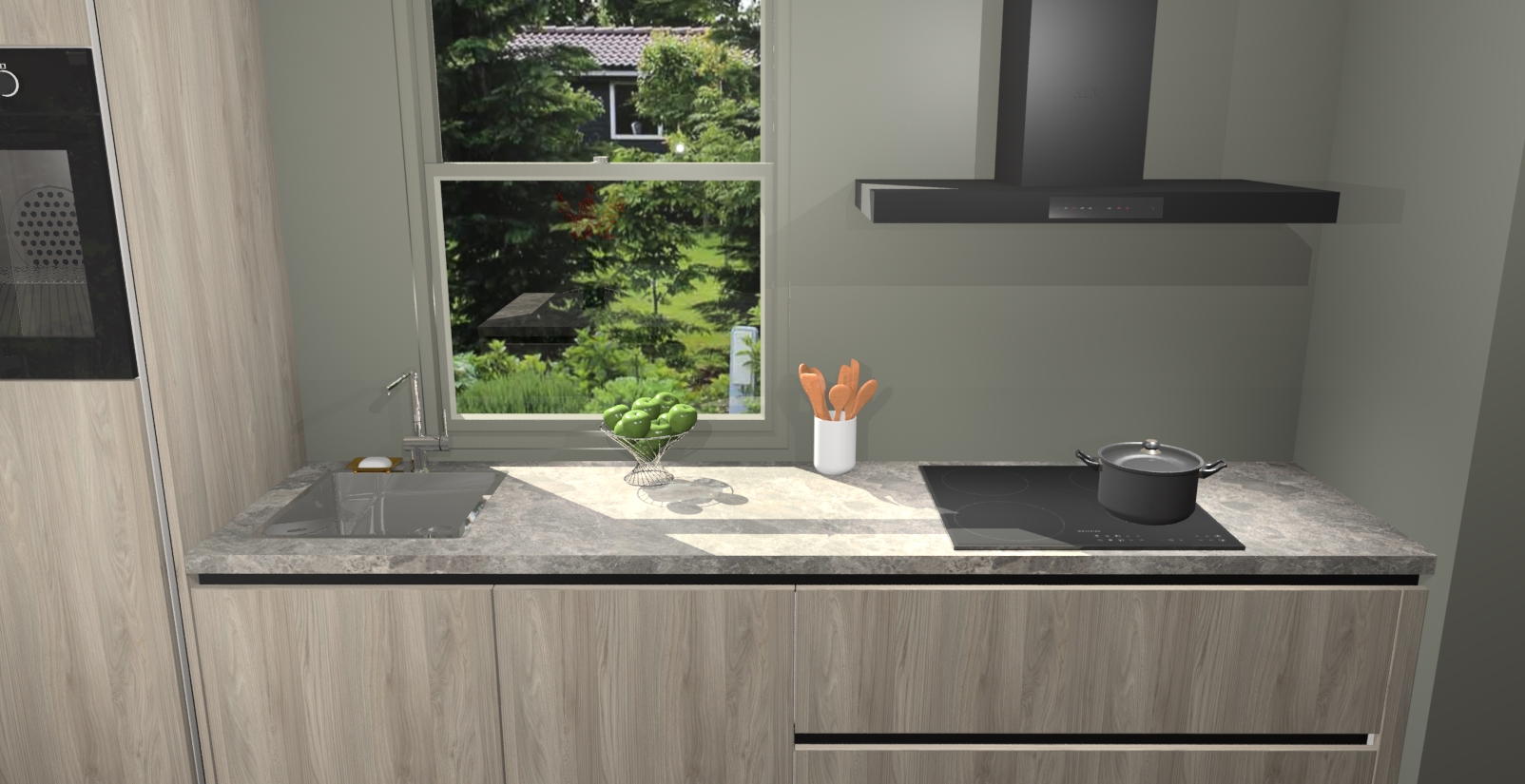 Een stijlvolle en praktische keuken als deze mag gezien worden. Dankzij de prachtige Olm afwerking wordt de keuken gemakkelijk het middelpunt van uw huis - hij ziet er geweldig uit onder allerlei lichtomstandigheden, van dag tot nacht!