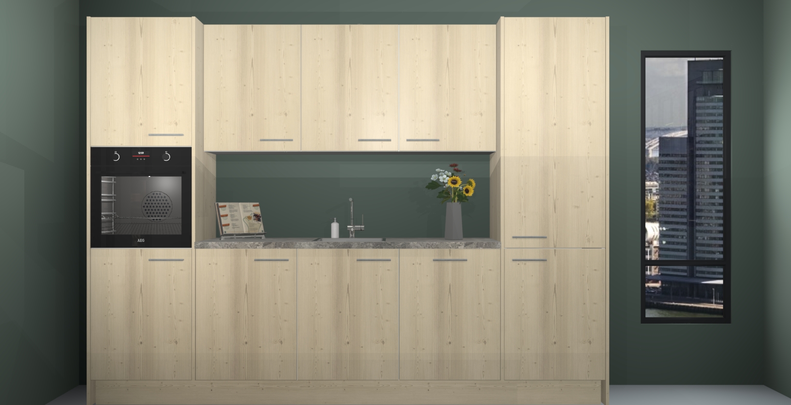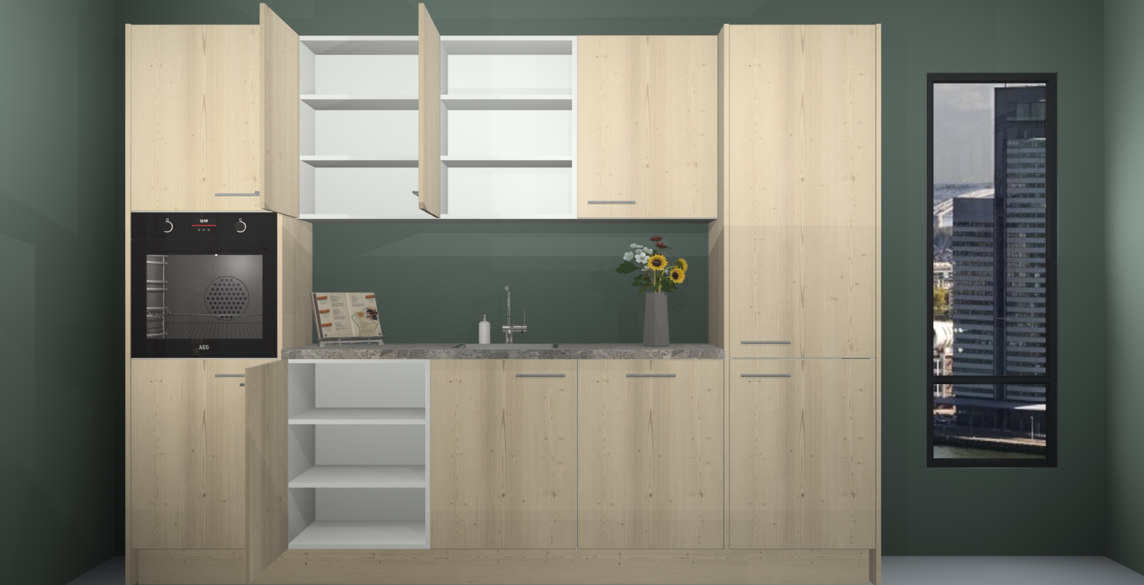 Nog indrukwekkender zijn onze hypermoderne softclose deuren die voorkomen dat uw kastdeuren per ongeluk dichtslaan. Bovendien is de binnenkant van elke kast gecoat in dezelfde houten tinten voor een extra vleugje stijl en verfijning. Als dat nog niet geweldig genoeg is, bevat de keuken vijf inbouwapparaten: oven, inductieplaat, afzuigkap, vaatwasser en koelkast. En als gemak ook een prioriteit is, dan raden we u ten zeerste aan om te kiezen voor de update naar AEG. Dit kan gemakkelijk na het plaatsen van uw bestelling.