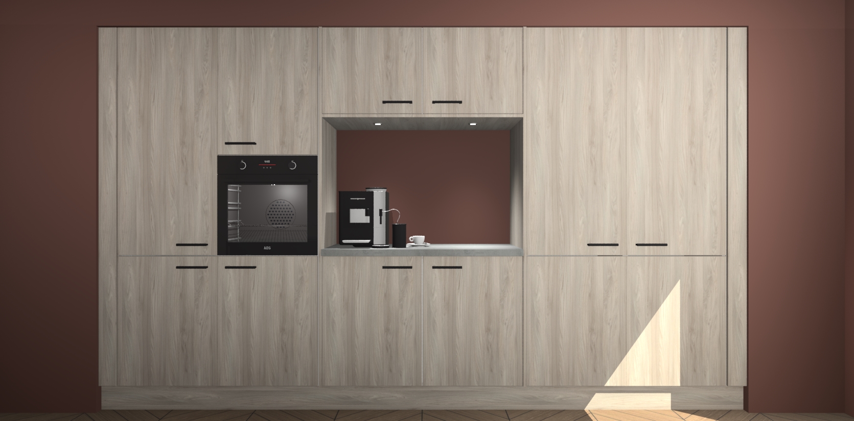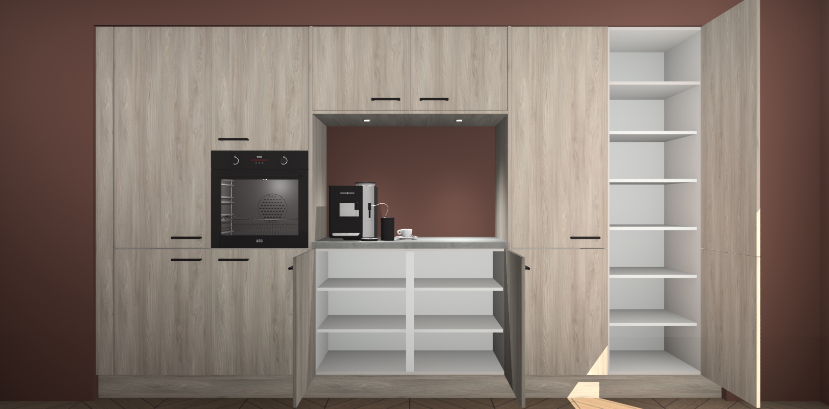 De Olm keuken Lodz wordt geleverd met een set van 5 ingebouwde apparaten: Een oven, inductiekookplaat, afzuigkap, vaatwasser en koelkast. Deze kunnen gemakkelijk worden opgewaardeerd naar AEG. Met de gegarandeerde lage prijs en de snelle levering van 7 weken kan u er op rekenen dat de Olm keuken Lodz zo snel mogelijk uw huis bereikt!