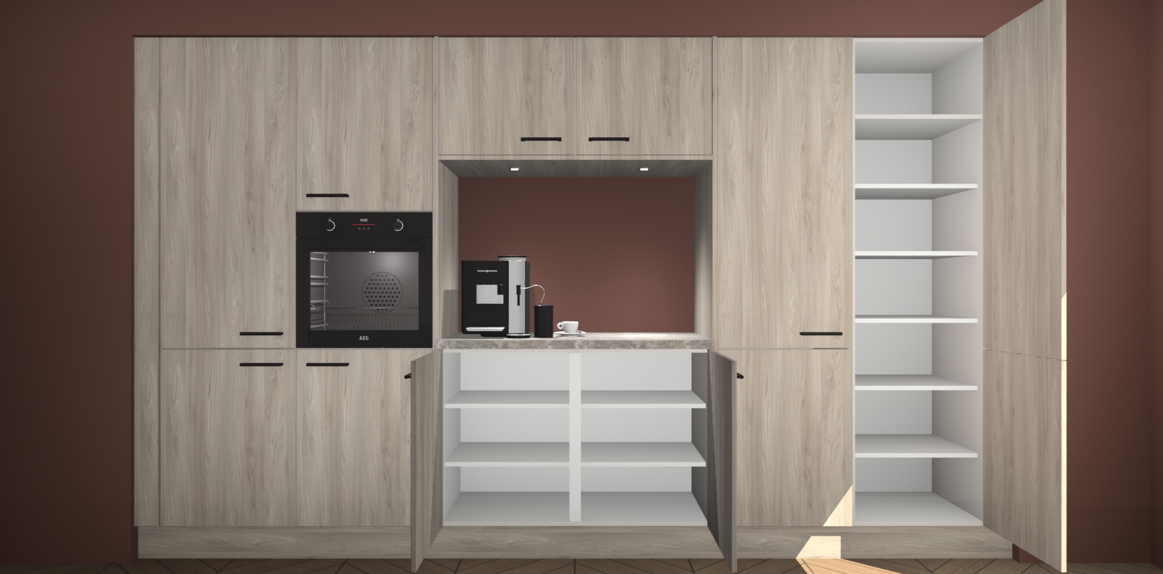 De Olm keuken Lodz wordt geleverd met een set van 5 ingebouwde apparaten: Een oven, inductiekookplaat, afzuigkap, vaatwasser en koelkast. Deze kunnen gemakkelijk worden opgewaardeerd naar AEG. Met de gegarandeerde lage prijs en de snelle levering van 7 weken kan u er op rekenen dat de Olm keuken Lodz zo snel mogelijk uw huis bereikt!
