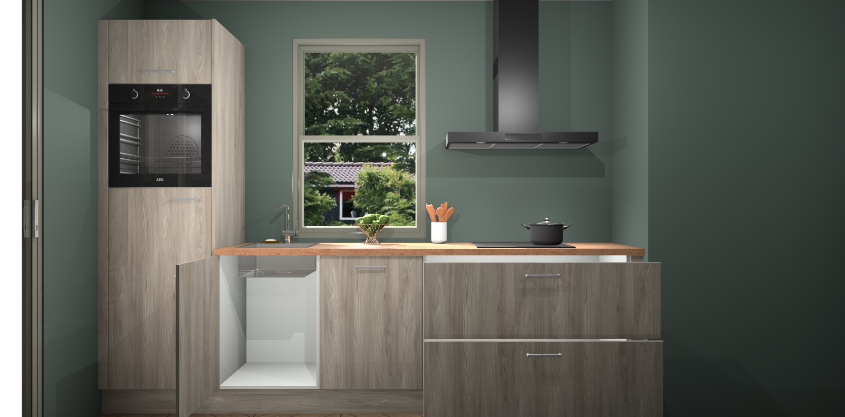 Een stijlvolle en praktische keuken als deze mag gezien worden. Dankzij de prachtige Olm afwerking wordt de keuken gemakkelijk het middelpunt van uw huis - hij ziet er geweldig uit onder allerlei lichtomstandigheden, van dag tot nacht!
