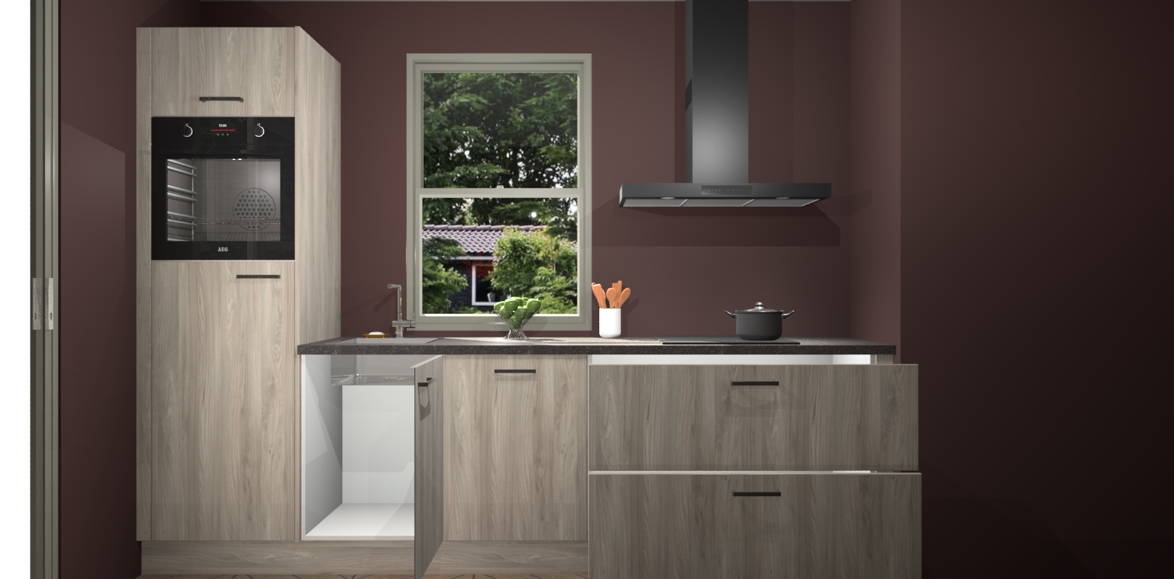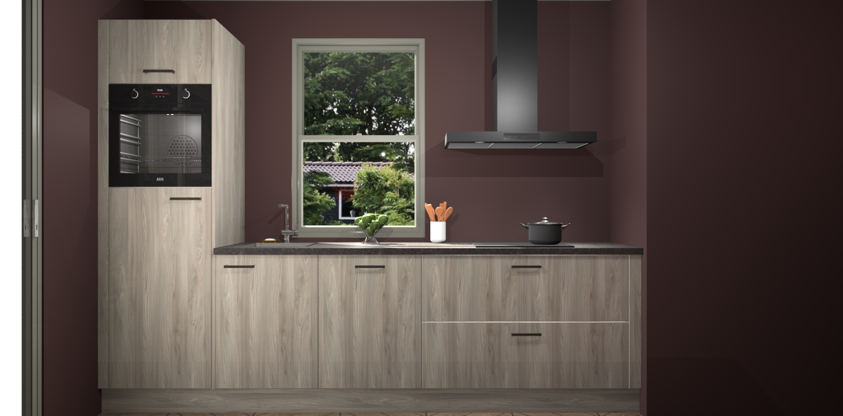 Een stijlvolle en praktische keuken als deze mag gezien worden. Dankzij de prachtige Olm afwerking wordt de keuken gemakkelijk het middelpunt van uw huis - hij ziet er geweldig uit onder allerlei lichtomstandigheden, van dag tot nacht!