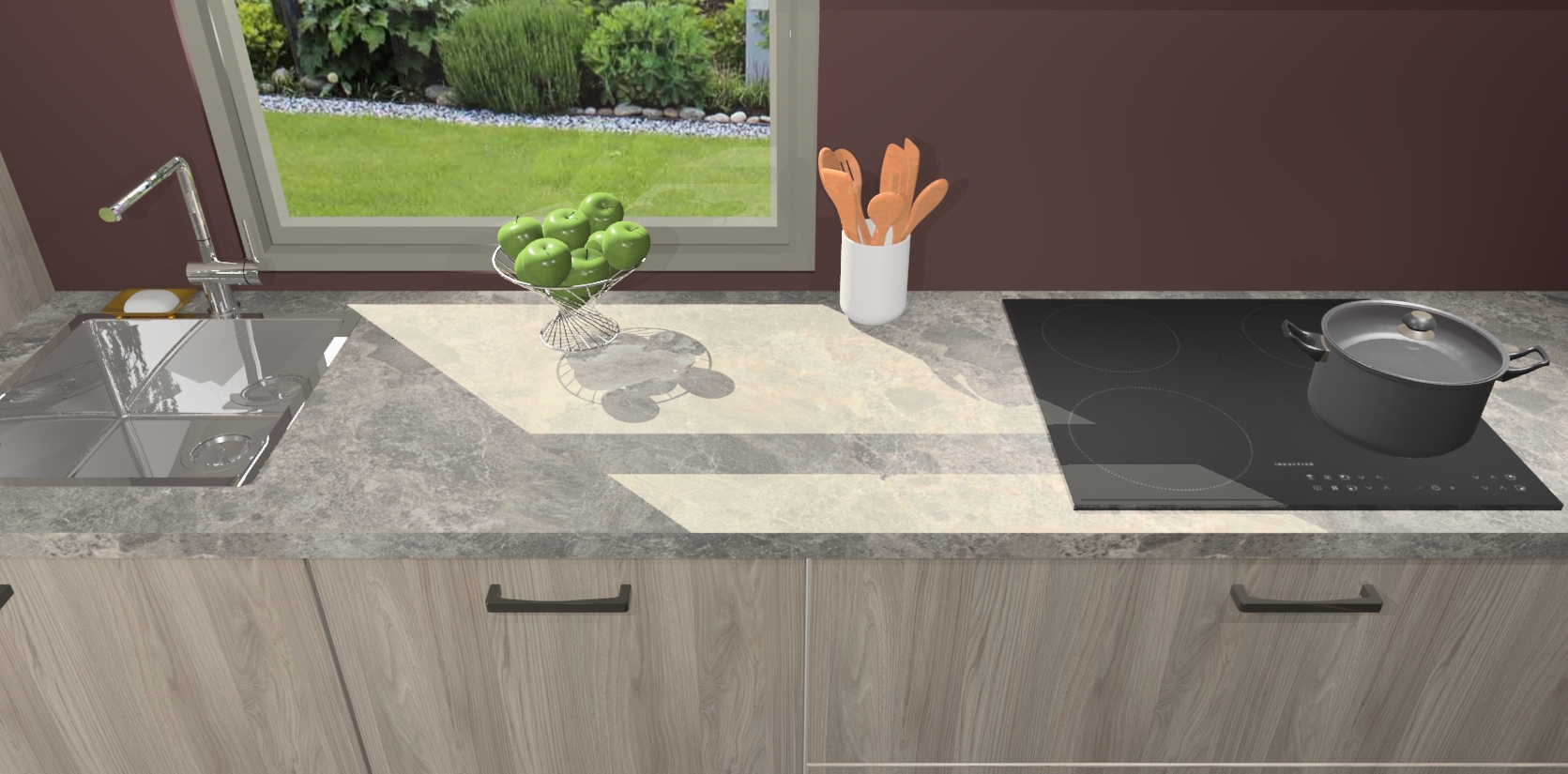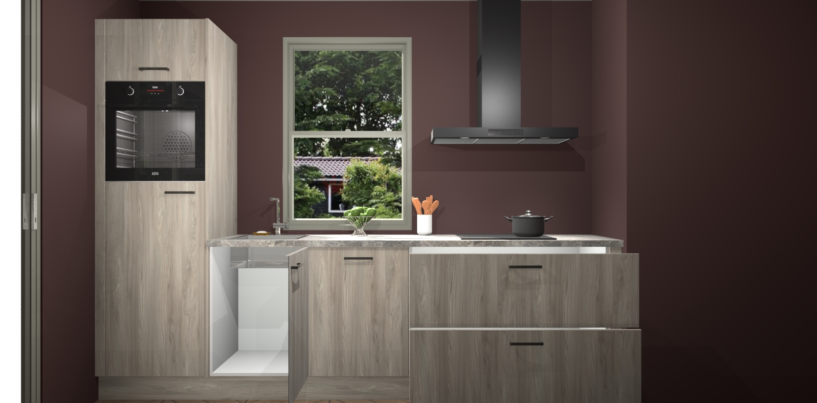 Een stijlvolle en praktische keuken als deze mag gezien worden. Dankzij de prachtige Olm afwerking wordt de keuken gemakkelijk het middelpunt van uw huis - hij ziet er geweldig uit onder allerlei lichtomstandigheden, van dag tot nacht!