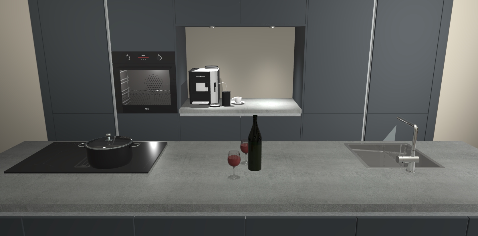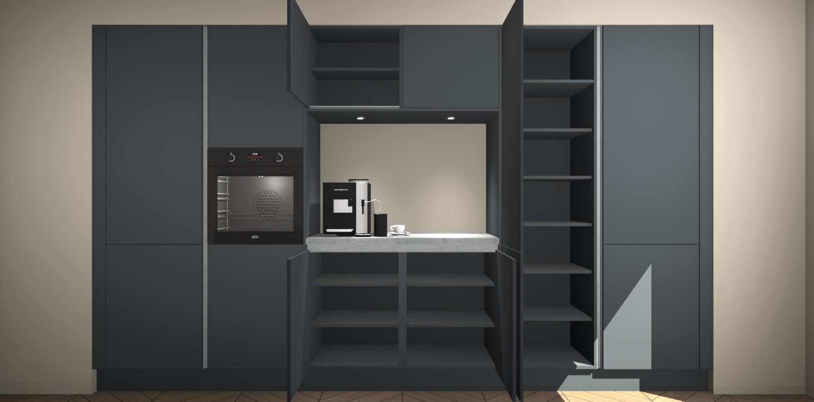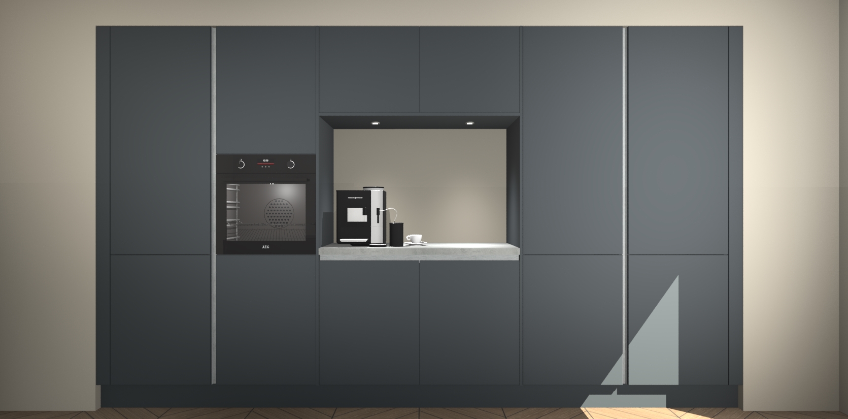 De Onyxgrijze greeploze keuken Lodz wordt geleverd met een set van 5 ingebouwde apparaten: Een oven, inductiekookplaat, afzuigkap, vaatwasser en koelkast. Deze kunnen gemakkelijk worden opgewaardeerd naar AEG. Met de gegarandeerde lage prijs en de snelle levering van 7 weken kan u er op rekenen dat de Onyxgrijze greeploze keuken Lodz zo snel mogelijk uw huis bereikt!